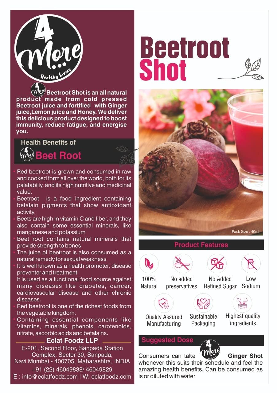 4more Natural Cold Pressed Beet Shot – 40ml Each | Healthy Beet Juice | No Added Preservatives | Rich In Nitrates | Helps Boost Stamina & Maintains Weight | For Daily Consumption (Pack of 6 = 240ml)