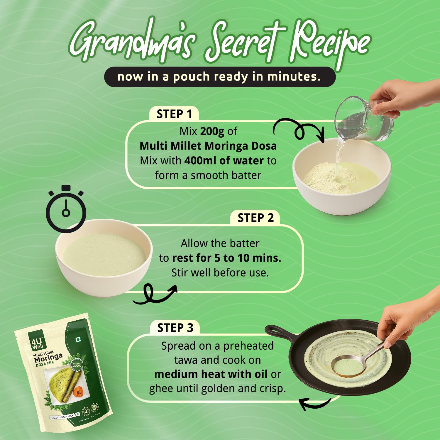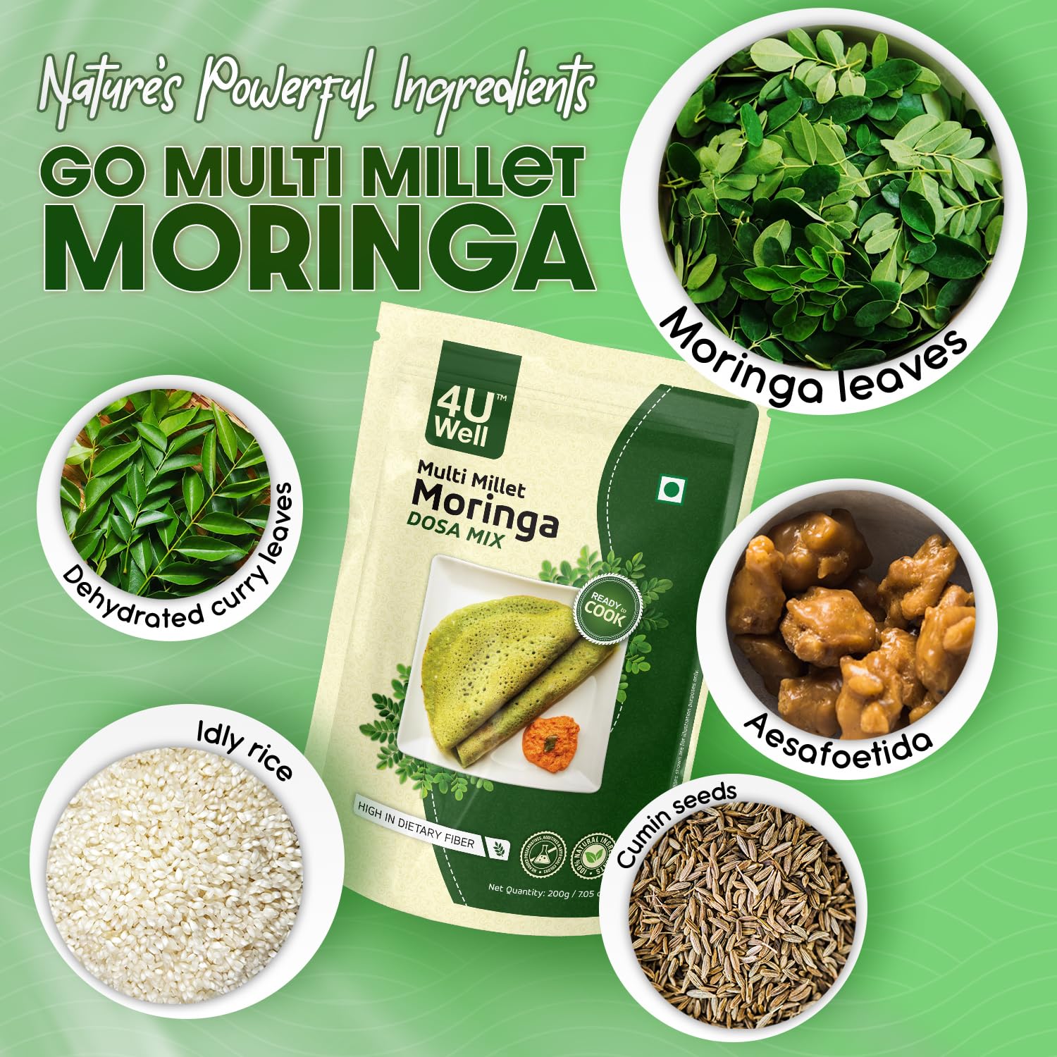 4UWell Instant Multi Millet Moringa Dosa Breakfast Mix 200g | High Protein and Fiber Pure Veg, Power of Five Dals In Every Dosa Indian Breakfast Mix | No of Servings Per Pack 8 (Approx)