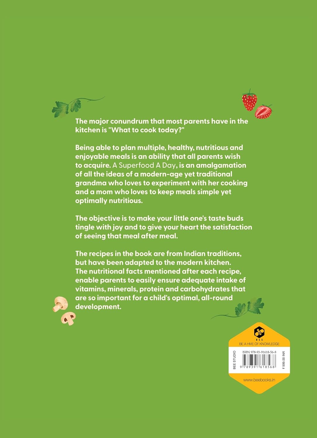 The major conundrum that most parents have in the kitchen is “What to cook today?” Being able to plan multiple, healthy, nutritious and enjoyable meals is an ability that all parents wish to acquire. A Superfood A Day, is an amalgamation of all the ideas of a modern-age yet traditional grandma who loves to experiment with her cooking and a mom who loves to keep meals simple yet optimally nutritious. The objective is to make your little one’s taste buds tingle with joy and to give your heart the satisfaction of seeing that meal after meal.