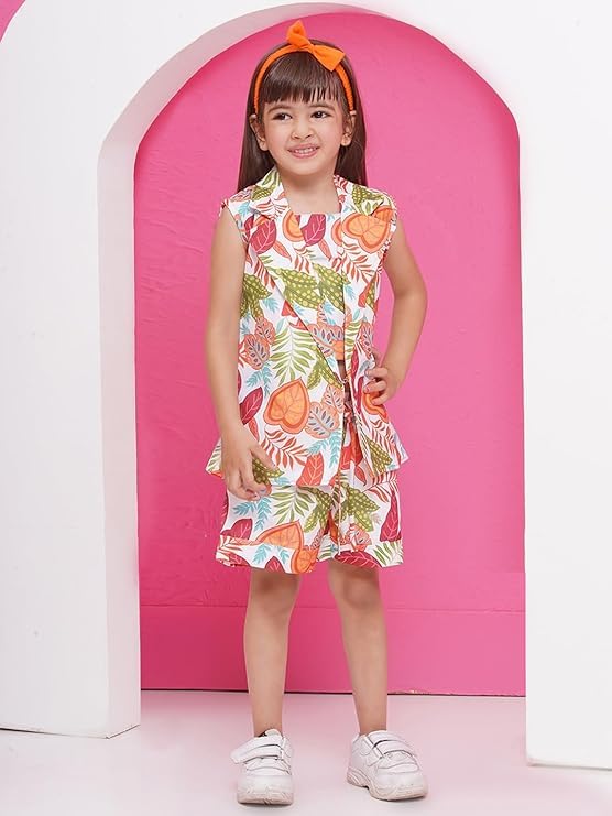 The AJ Dezines Printed Cotton Top short and Jacket for Girls is a vibrant and playful outfit designed to bring joy to young fashionistas. This ensemble consists of a top, pant, and jacket, all made from soft and comfortable cotton fabric. The top showcases a three-fourth sleeve design and features a captivating multi-color print that adds a pop of energy to the outfit. The half pant complements the top perfectly, providing a comfortable fit for your daughter. The matching jacket completes the look, offering both style and protection, making it an ideal choice for various casual occasions. With its lively colors and comfortable cotton fabric, this AJ Dezines set is a perfect addition to your daughter’s wardrobe, encouraging her to express her unique personality. This cord set for girls is available in different colors.