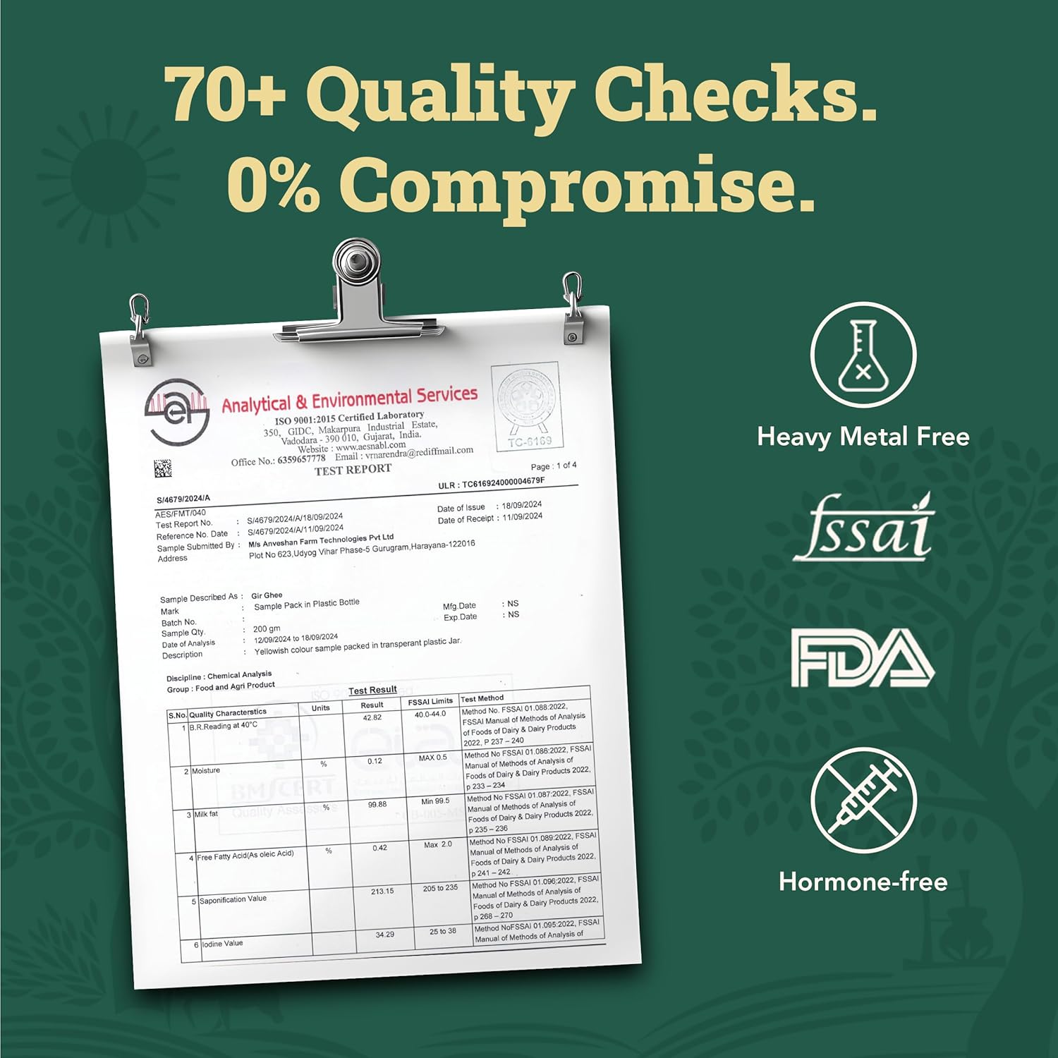 LAB-TESTED GHEE: We perform a total of 17 lab tests on our A2 Desi Gir Cow Ghee to make sure that every batch of our ghee undergoes strict quality checks.