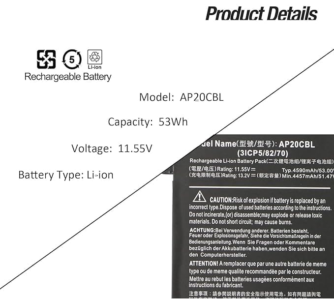 Please check the model and shape of the original battery. Make sure you have the right battery Battery information: Condition: Voltage: 11.55V Capacity: 53Wh 4590mAh Compatible Part Numbers 3 Cells: AP20CBL KT.0030B.002 31CP5/82/70 Compatible Models: (Use “Ctrl”+”F” to find your laptop model) for the swift 3 series SF314-43: SF314-43-R0JM SF314-43-R0NU SF314-43-R1UJ SF314-43-R26R SF314-43-R2DX SF314-43-R2R4 SF314-43-R3BC SF314-43- R3BC SF33 14-43 -R4LC SF314-43-R4VE SF314-43-R63N SF314-43-R6XQ SF314-43-R7RH SF314-43-R8H2 SF314-43-R8KB SF314-43-R8P1 SF314-43-43-R8P1 SF314-43-43-43-R8P1 SF314–R9AR SFP 314-43- R9JB for Swift 3 Series SF314-511: SF314-511-32SH SF314-511-38Z6 SF314-511-51WP SF314-511-35EG SF314-511-540R for As pire 5 Series A5 15-45: A515-45-R00P A515-45 -R0J5 A515-45-R1DK A515-45-R1WP A515-45-R1YC A515-45-R2QQ A515-45-R386 A55 15-45 -R3V5 A515-45-R48C A515-45-R5E0 A515-45-R6DM A515-45 -R6CJ A515-45-R7WZ A515-45-R8AH A515-45-R8KE A515-515-R8KE A515-515-R8KE 35-r9 PX for As pire 5 Series A515-46-R14K; For As pire 5 Series A515-56 A515-56T A515-56G For As pire 7 Series A715-43G, For As pire Vero AV15-51 Series: AV15-51-51X9 AV15-51-522W AV15-51-547X AV15-51-55B2 AV15-51-54S1 AV15-51-54S1 AV15-51-54S1 AV15-51-544S1 UT AV15 -51- 55K2 AV15-51-57WC AV15-51-583D AV15-51-73DM AV15-51-7617 AV15-51-76YC AV15-51-7739 AV15-51-78SE AV15-51-78S; F AV15-15 51-N20C5 for TravelMate Spin B3 Series TMB311RNA-32: TMB311RNA-32-C0X1 TMB311RNA-32-P10E TMB311RNA-32-P3MM TMB311RNA-32-P26U SF314-5 11-22 5L SF314-511-54EB SF314-511-55CA SF314-511-57T8 SF314-51 1-593F SF314-511-71ZN SF314-511-745J SF314-511-786H SF314-511-786H 314-5 11-79EG for TravelMate P2 214-41-G3 Series TMP214-41-G3 NOTE: for optimal battery use: 1. Discharge the new battery to 5%. -10% (not 0%), then charge and cycle 3-4 times to wake up the new battery. 2. The important point is to perform a full discharge charge every two months to extend the battery life. 3. Do not connect