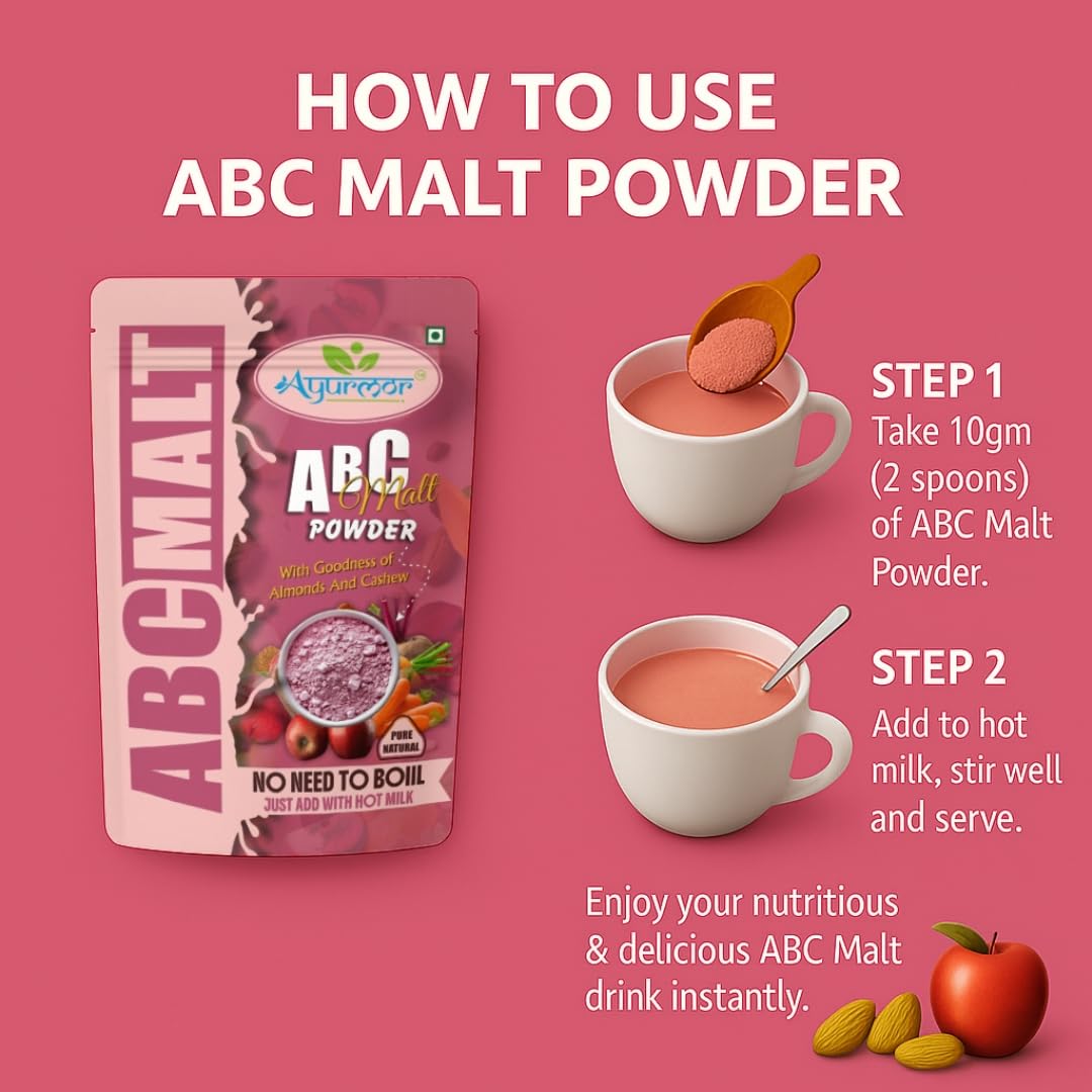 ✅ HOW TO USE : Add 1 spoon Ayurmor ABC Malt Powder in Cup , Add 200ml Hot or Cold Water/ Milk / Tea & Stir it well.