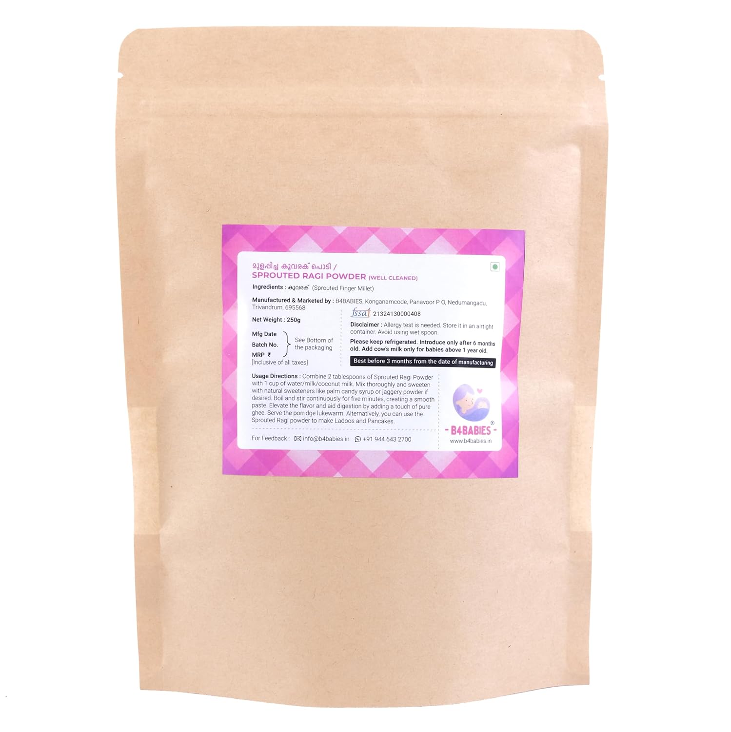 B4BABIES Sprouted Ragi Powder | Homemade | 100% Pure & Natural | No Added Preservatives (500g)