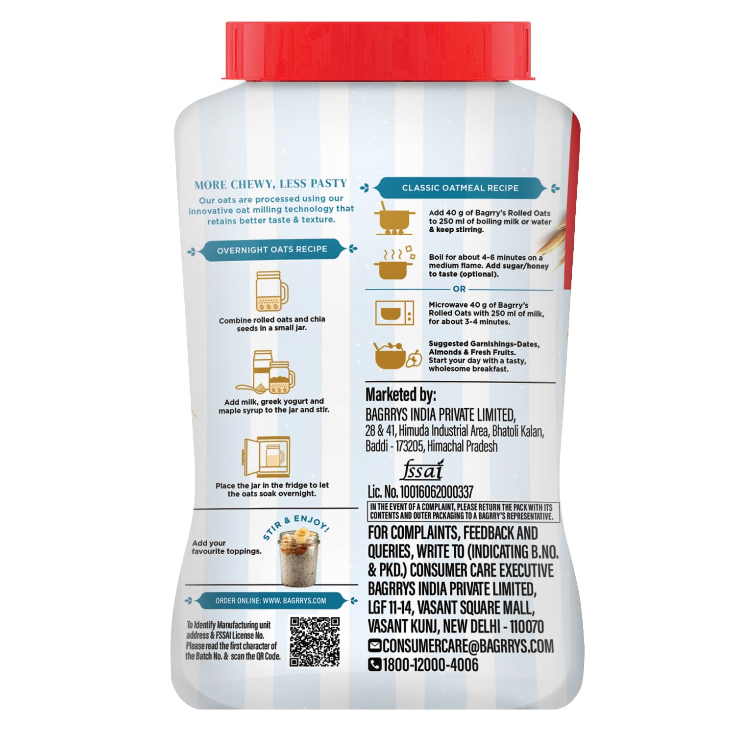 Rich in Fibre & Protein Each serving of Bagrry’s Rolled Oats is loaded with dietary fibre and plant-based protein—an ideal combo for a healthy gut, longer satiety, and steady energy release. Fibre promotes digestion and helps maintain cholesterol levels, while protein supports muscle repair and keeps you energised throughout the day.Wholegrain Goodness Sourced from 100% wholegrain oats, these oats retain all parts of the grain—offering a complete nutritional profile. Wholegrains are known to support heart health, aid metabolism, and deliver essential nutrients like B vitamins, iron, and magnesium, naturally.No Added Preservatives At Bagrry’s, we believe in keeping it real. That’s why our Rolled Oats come with no added preservatives or artificial ingredients—just clean, honest oats. Enjoy the pure taste of nature, knowing you’re choosing better for yourself and your family.