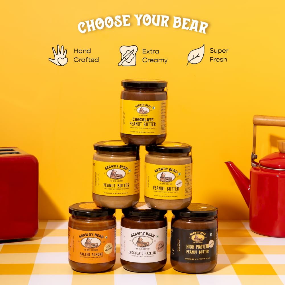 100% NATURAL NUT BUTTER Brawny Bear’s Chocolate Protein Peanut Butter is made using just four real ingredients: Whole and Sun-Dried Ground Dates, Roasted Peanuts, Whey Protein Concentrate and Unsweetened Cocoa. Just that, No other Additives and absolutely No Added Flavours or Colours!