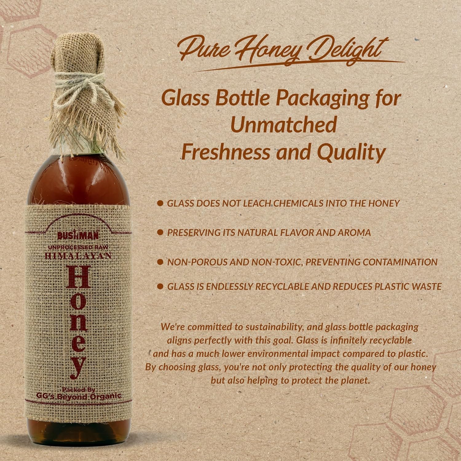 We conserve honey bees in scientifically designed wooden beehives. We Bring it to your table in glass bottle guaranteed that no value is taken out or anything ever added in our raw honey. The glass bottles are narrow mouthed easy and hygienic to use without the need of a spoon.