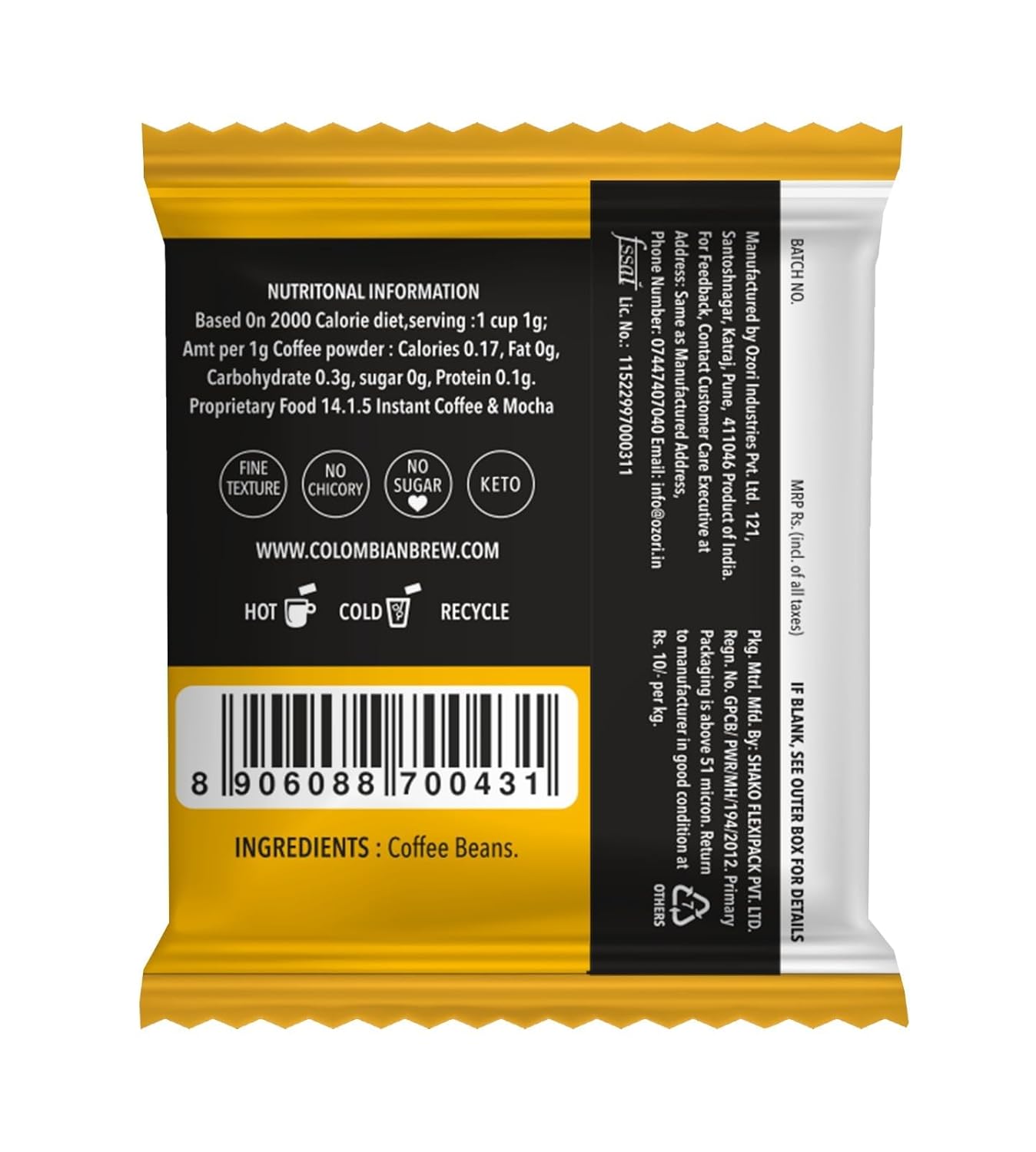 Colombian Brew Orginal Instant Coffee Powder Sachets, Pack of 200