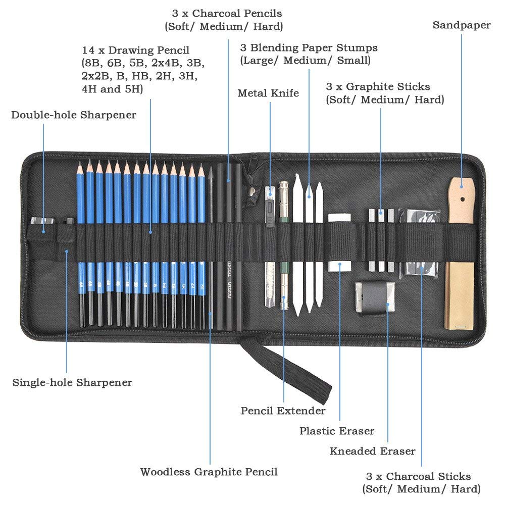 Complete Drawing Set Packed with everything you need to go from basic outline to highly-detailed masterpiece, this travel-friendly art kit contains all the essential graphite and charcoal pencils to make drawing, shading, blending and sketching efficient and gorgeous.