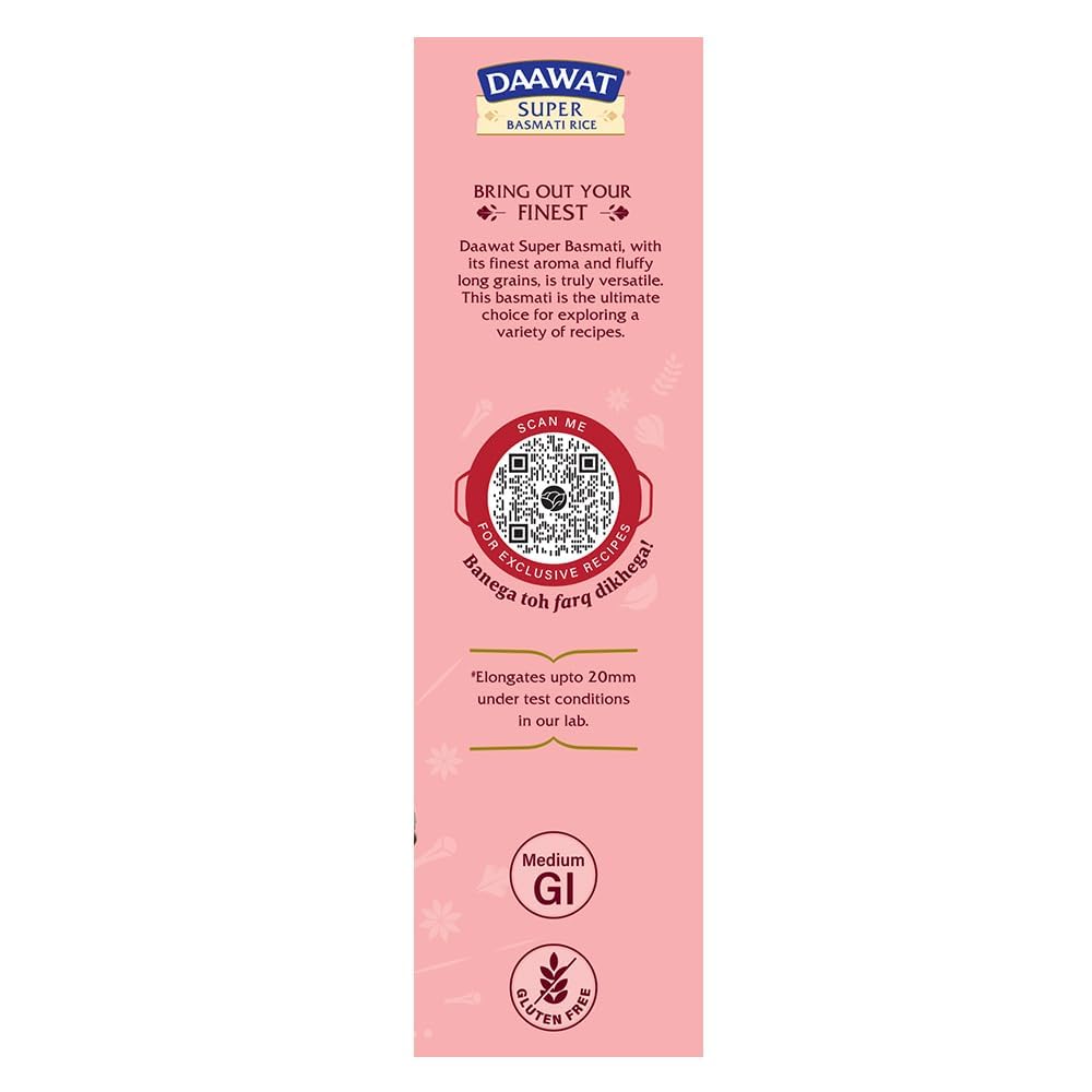 Daawat Super Basmati Rice 1Kg | Fluffy Long Grains| Cooked upto 20mm