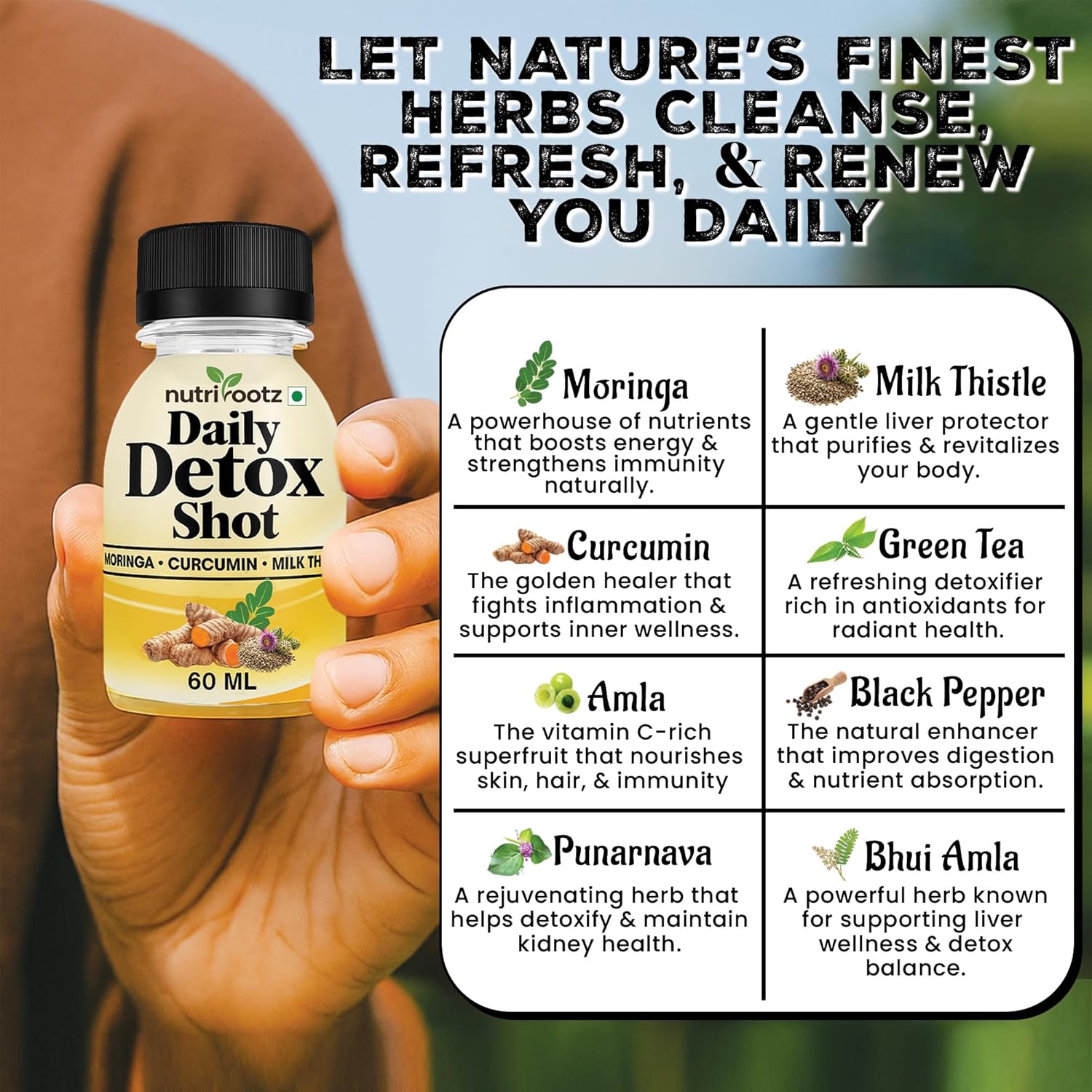 ✅ 𝐂𝐎𝐌𝐏𝐋𝐄𝐓𝐄 𝐍𝐀𝐓𝐔𝐑𝐀𝐋 𝐃𝐄𝐓𝐎𝐗 𝐅𝐎𝐑𝐌𝐔𝐋𝐀: Cleanse and rejuvenate your body with NutriRootz Daily Detox Shot, powered by Moringa, Curcumin (Turmeric Extract), Milk Thistle & Bhui Amla — a potent herbal blend that supports daily detoxification and overall wellness.