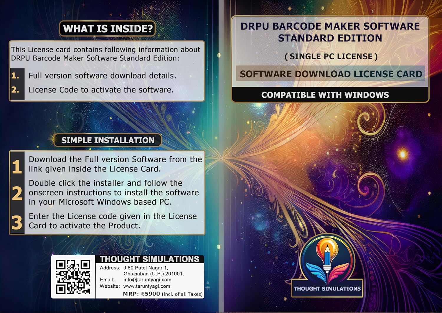 Product Description This Software Download License Card contains Full version download info and License code of DRPU Barcode Maker Software Standard Edition ( Single PC LICENSE ), Compatible with Windows PC and Laptops. What is inside: This License card contains following information about DRPU Barcode Maker Software Standard Edition: 1. Full version software download details. 2. License Code to activate the software. Simple Installation: 1. Download the Full version Software from the link given inside the License Card. 2. Double click the installer and follow the onscreen instructions to install the software in your Microsoft Windows based PC. 3. Enter the License code given in the License Card to activate the Product.