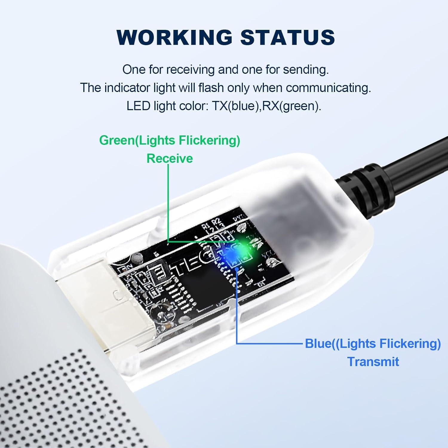 The integrated circuit board of the USB to TTL serial cable is encapsulated in a transparent plastic shell, which protects the components while allowing a clear view of the internal components. Different colored indicator lights (blue and green) are used to send and receive data, TX (blue), RX (green). Contains TX, RX and GND pins for easy connection to your serial device