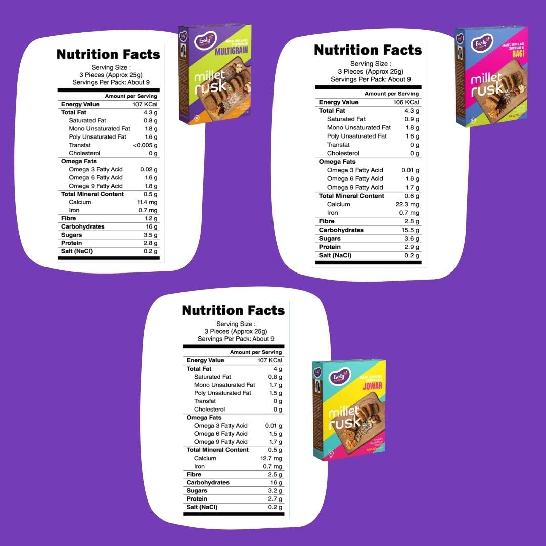 Early Foods – Pack of 3 : Ragi, Jowar & Multigrain Rusks | Millet Rusk Sugar Free | No Maida Toast | Rusks for Kids | Millet Toast Biscuits 163g x 3