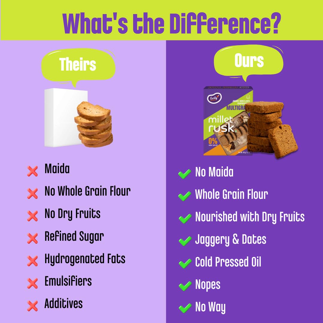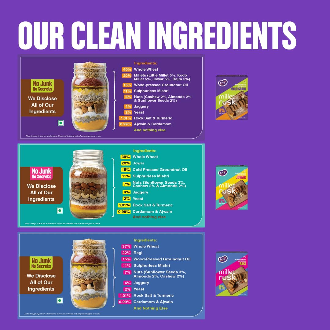 100% CLEAN Ingredients: Our Millet Rusk is crafted with a nutritious blend of millets, whole wheat, jaggery/gur, cold-pressed groundnut oil, almonds, assorted nuts and seeds. It’s wholesome and a guilt-free Millet Toasts.