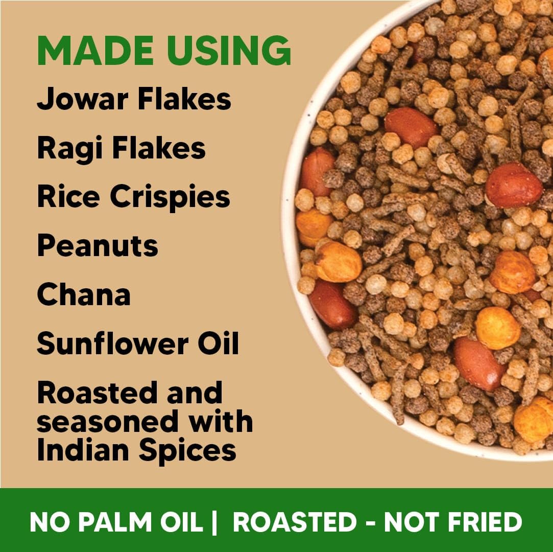 Millet Namkeen is made of Millet – Ragi & Jowar along with Rice crispies. In addition to that we use little amount of sunflower oil for roasting, sea salt & Indian spices