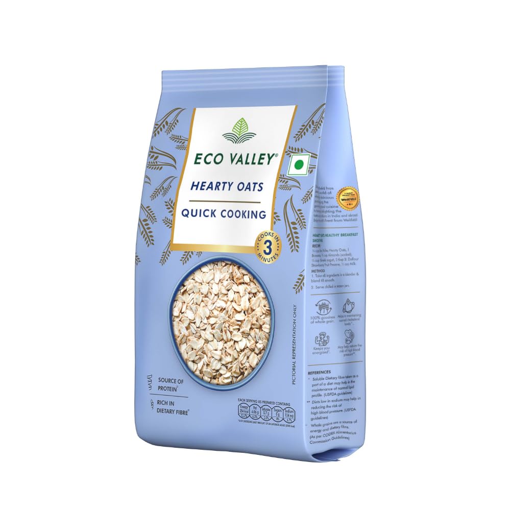 Kick-start your day with super-satisfying Eco Valley Hearty Oats – a convenient and healthy alternative to your regular breakfast! This is an ideal breakfast choice for those who have made health and fitness their priority. These 100% natural rolled oats are a perfect blend of health and taste. Since these oats can be prepared in just 3 minutes, you won’t have any reason to skip your breakfast. Rich in dietary fiber and protein, these oats have a rich array of health benefits. An easy-to- cook cereal, Eco Valley Hearty Oats are good for your lifestyle in more ways that you can imagine. One can cook multiple delicious recipes with these oats or include them in smoothies. Minimal effort and time are required to prepare these healthy and delicious oats. Serve it hot with milk, juices, honey, fresh and dried fruits and relish the goodness of oats and an amazing taste at the same time. Can also be used as a staple ingredient in your everyday meals. If you are on a weight loss journey, oats will be your trusted companion. Being gluten free and without any added sugar, these oats also help in managing cholesterol