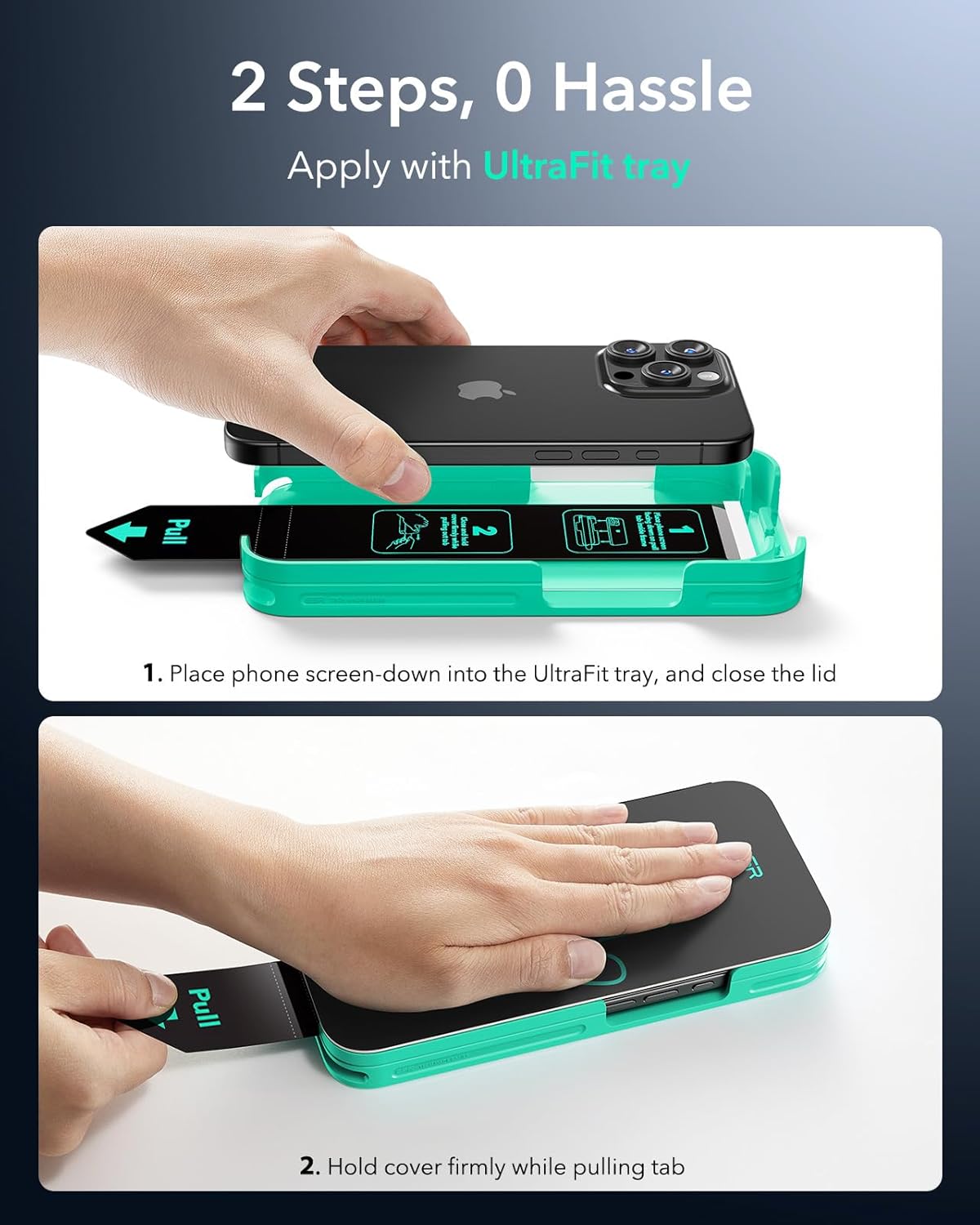 Flawless Fit in a Flash: includes an UltraFit tray for the screen protector (read carefully before use), a cleaning kit, and a dust-repellent adhesive for quick, bubble-free application