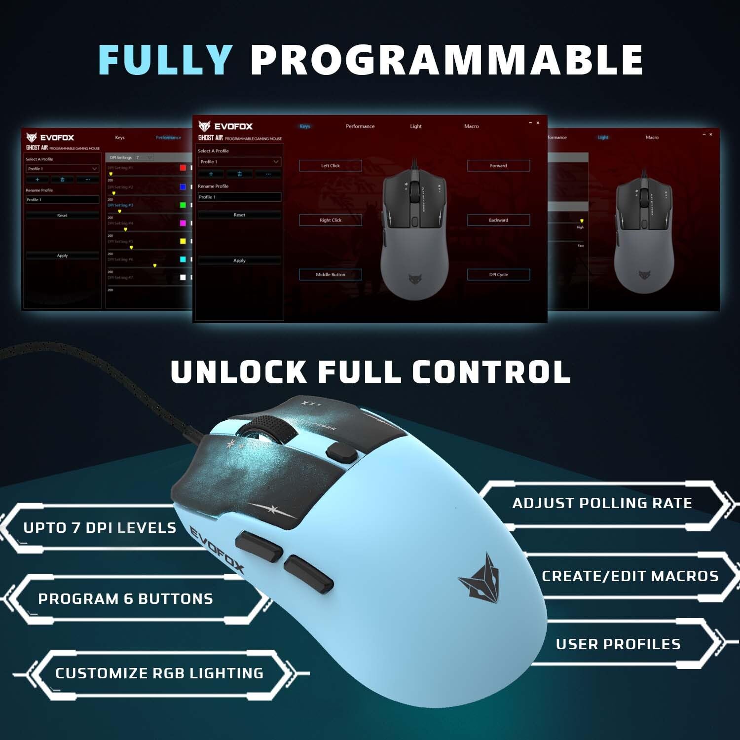 EvoFox Performance Series Ghost Air Ultra Lightweight(54g) Gaming Mouse | Pixart Sensor, Upto 1000Hz Polling Rate & 12400 DPI | Honeycomb RGB Lighting | Fully Programmable with Windows Software & On-board memory | Blue
