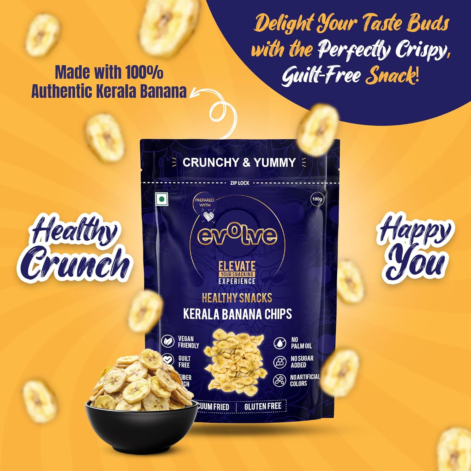 Evolve Kerala Banana Chips Healthy Snacks for Kids, Adults | Gluten-Free, Vegan, No Sugar or Colors, Vacuum Fried, Freshly Made| Ideal for Weight Loss, 100 gram
