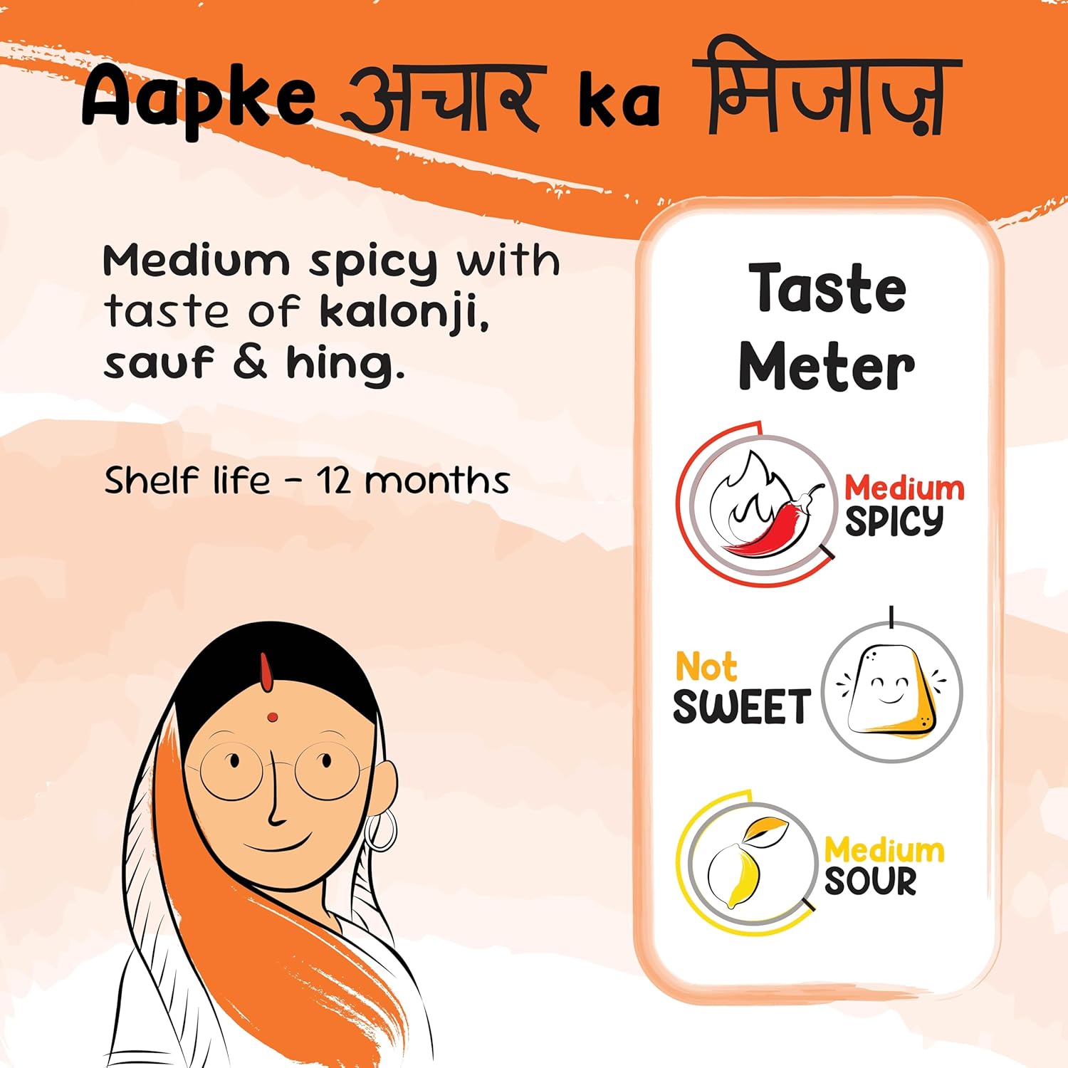 LEGACY OF TASTE: This pickle follows a treasured Punjabi recipe—sour, slightly spicy, and bursting with the punch of hing—passed down through generations of mothers and grandmothers.
