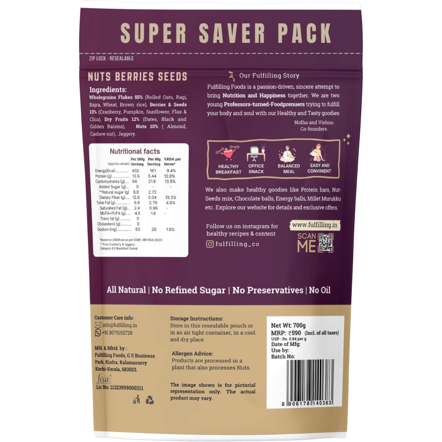 Introducing the ultimate breakfast companion – our delectable Nuts Berries Seeds Muesli, meticulously crafted to tantalize your taste buds and nourish your body from within. Say goodbye to bland breakfasts and hello to a flavor-filled adventure that’s as nutritious as it is indulgent. Our Muesli is a symphony of nature’s finest ingredients, featuring a tantalizing blend of almonds, chia seeds, and dates, perfectly complemented by a medley of nutrient-rich seeds like pumpkin, sunflower, chia seeds, and flax seeds. Each crunchy bite is a celebration of wholesome goodness, meticulously curated to elevate your mornings and fuel your day with unstoppable energy. Dive into a world of pure bliss with our Muesli – a guilt-free indulgence free from preservatives, artificial flavors, or refined sugars. Packed with protein, fiber, and essential nutrients, it’s the perfect choice for health enthusiasts and weight watchers alike. Start your day on the right note and watch as your energy levels soar Resealable zip lock pouches ensure that every bite of our Muesli is as fresh and delightful as the first. Lock in the crunchiness and savor the freshness with each mouthful, as you embark on a journey of taste and texture like never before. Discover the irresistible allure of our Muesli – a vegan delight that promises to awaken your senses and nourish your soul. Whether you’re craving a wholesome breakfast or a midday snack, Fulfilling Muesli is the perfect choice for discerning palates seeking a blend of flavor and nutrition. Elevate your breakfast routine with our Muesli– a tantalizing fusion of flavors and textures that promises to tantalize your taste buds and leave you craving for more. Add a touch of sweetness to your day, the healthy way, with our MUESLI – the breakfast of champions!
