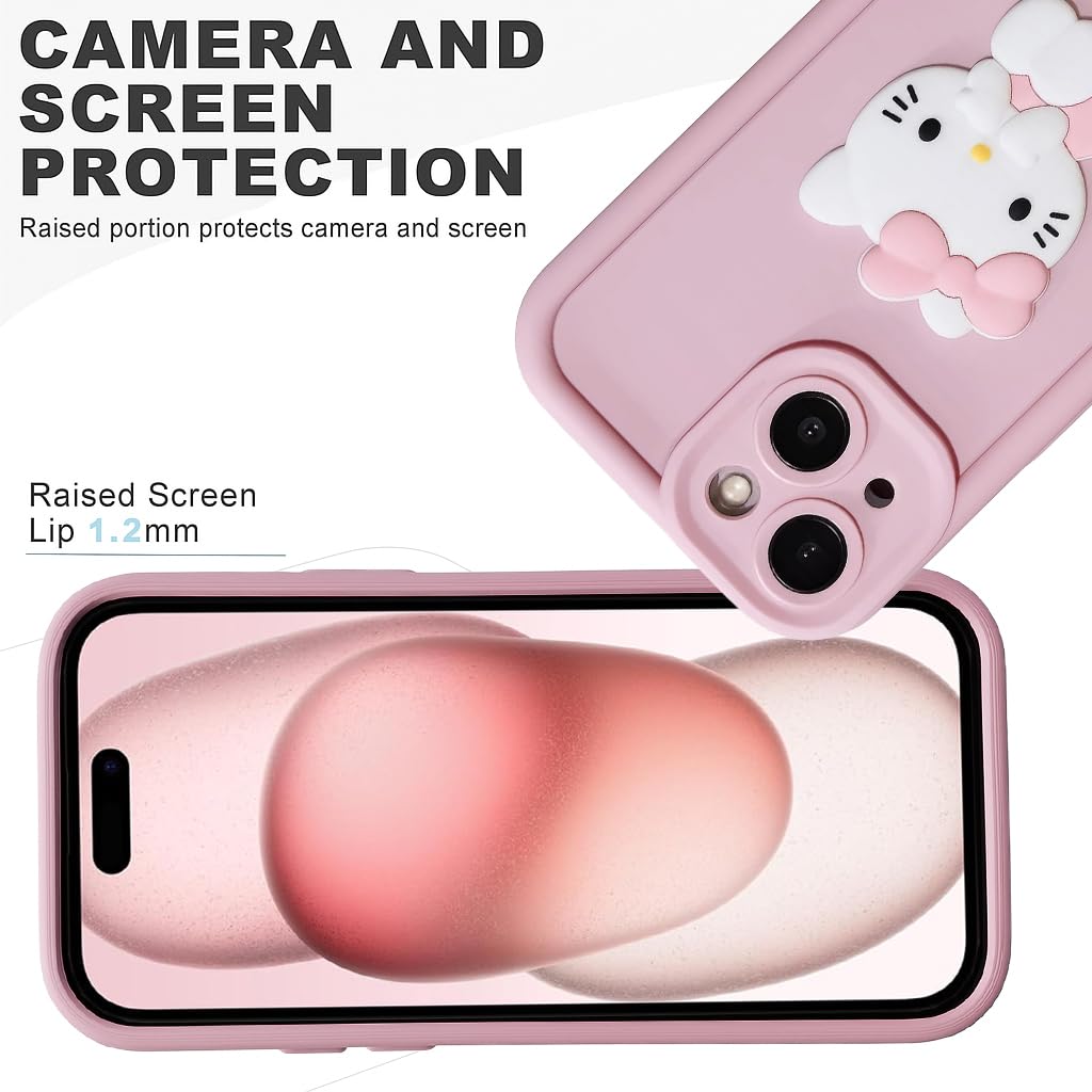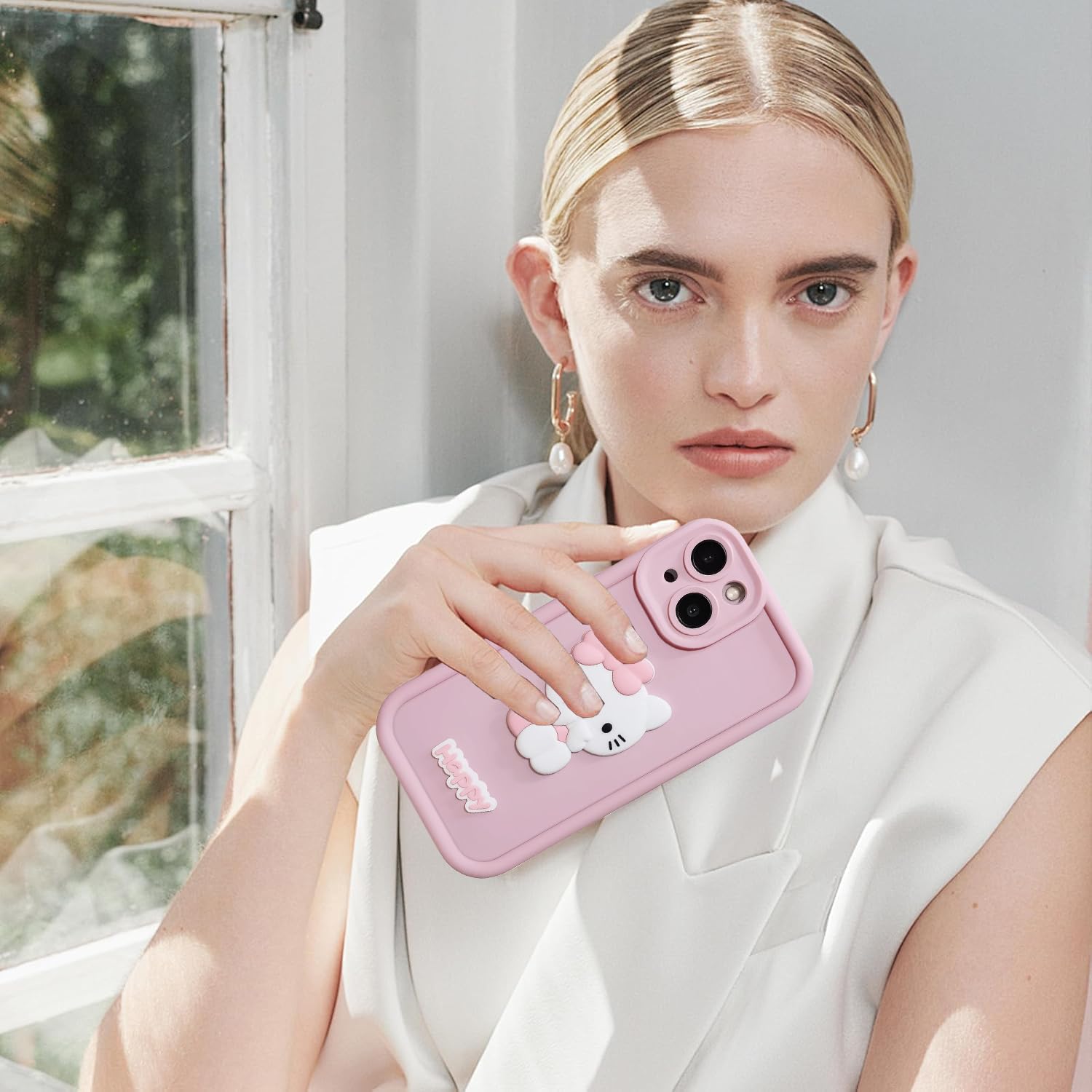 GoldKart Soft Silicone 3D Kitty Cover for iPhone 15 | Cute Cartoon Character Case for Girls & Women | Shockproof, Durable & Anti-Fingerprint | Pink