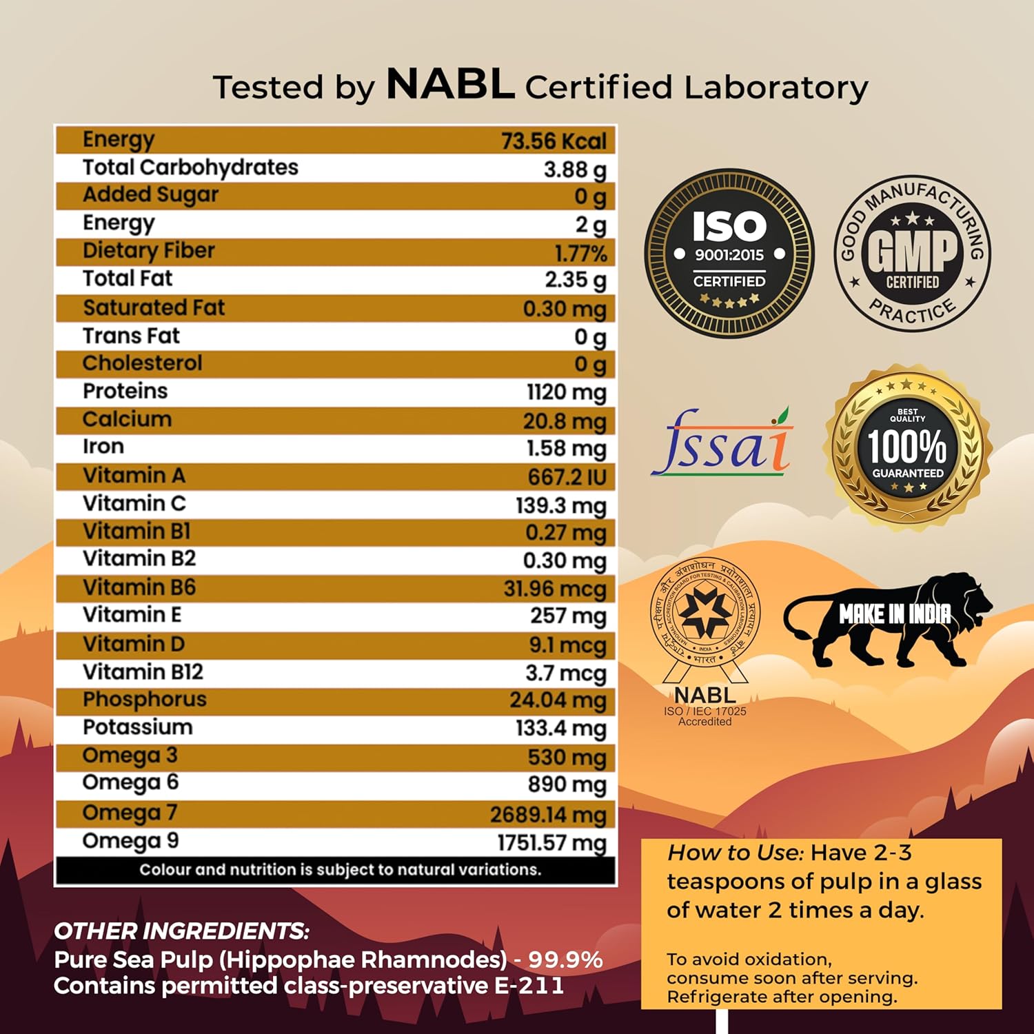 🔹 DAILY DOSE OF PLANT-BASED POWER – This nutrient-rich pulp is packed with Himalayan Sea Buckthorn, offering a natural blend of Vitamins C, A, E, Iron, and Omega 3, 6, 7 & 9. A perfect way to support your immunity, energy, and daily wellness — naturally and effectively.
