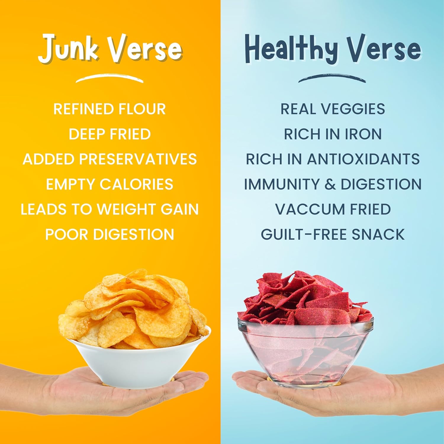 FOR ALL AGES, EVERY OCCASION: From school tiffins to boardroom breaks, our healthy chips are crafted for everyone. Ideal healthy snacks for adults and fantastic snacks for kids too! These colorful snacks for kids are healthy options that make eating vegetables fun and delicious.
