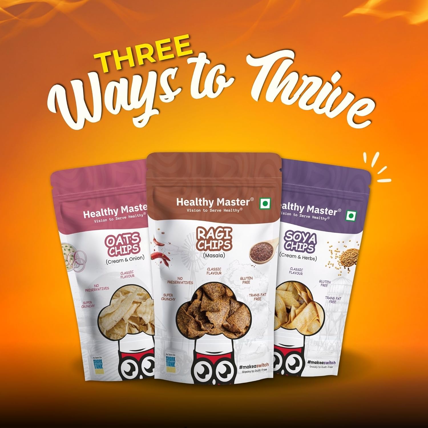 SMART SNACKING MADE EASY: Snack with purpose! Healthy Master’s 3 Chips Combo—featuring Oats, Soya, and Ragi Chips- is a wholesome trio of millet snacks that are crunchy, flavorful, and packed in a convenient chips pack. From busy mornings to midnight munchies, this is the ultimate mix of healthy snacks for every occasion.