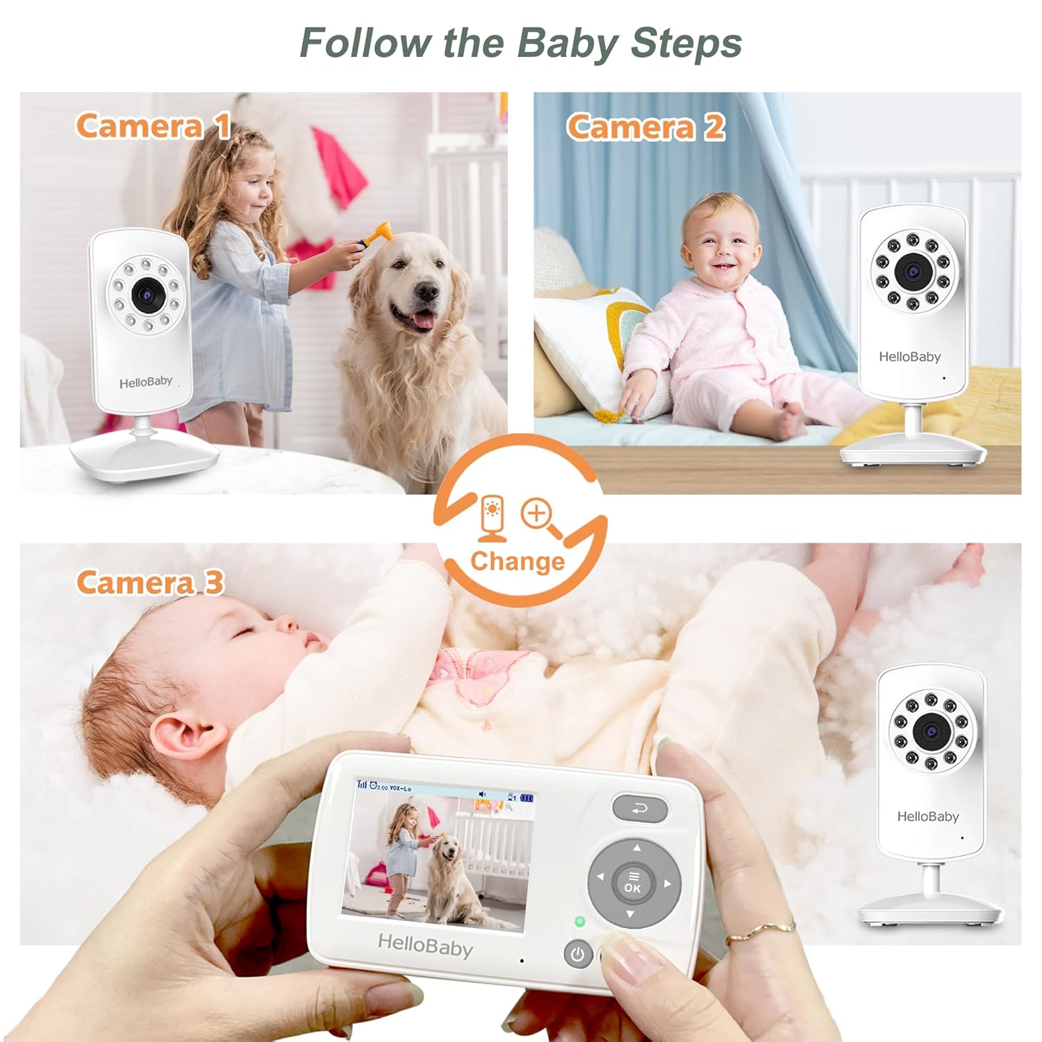 Hellobaby Baby Monitor With 3 Cameras:This Baby Monitor Kit Comes With 3 Cameras, Also Supports 2X Zoom to Watch Your Baby. When You Buy this Set, You Get One Monitor and 3 Cameras, You Can Use to Monitor Your Baby and Then Monitor Your Cat or Dog at the Same Time.