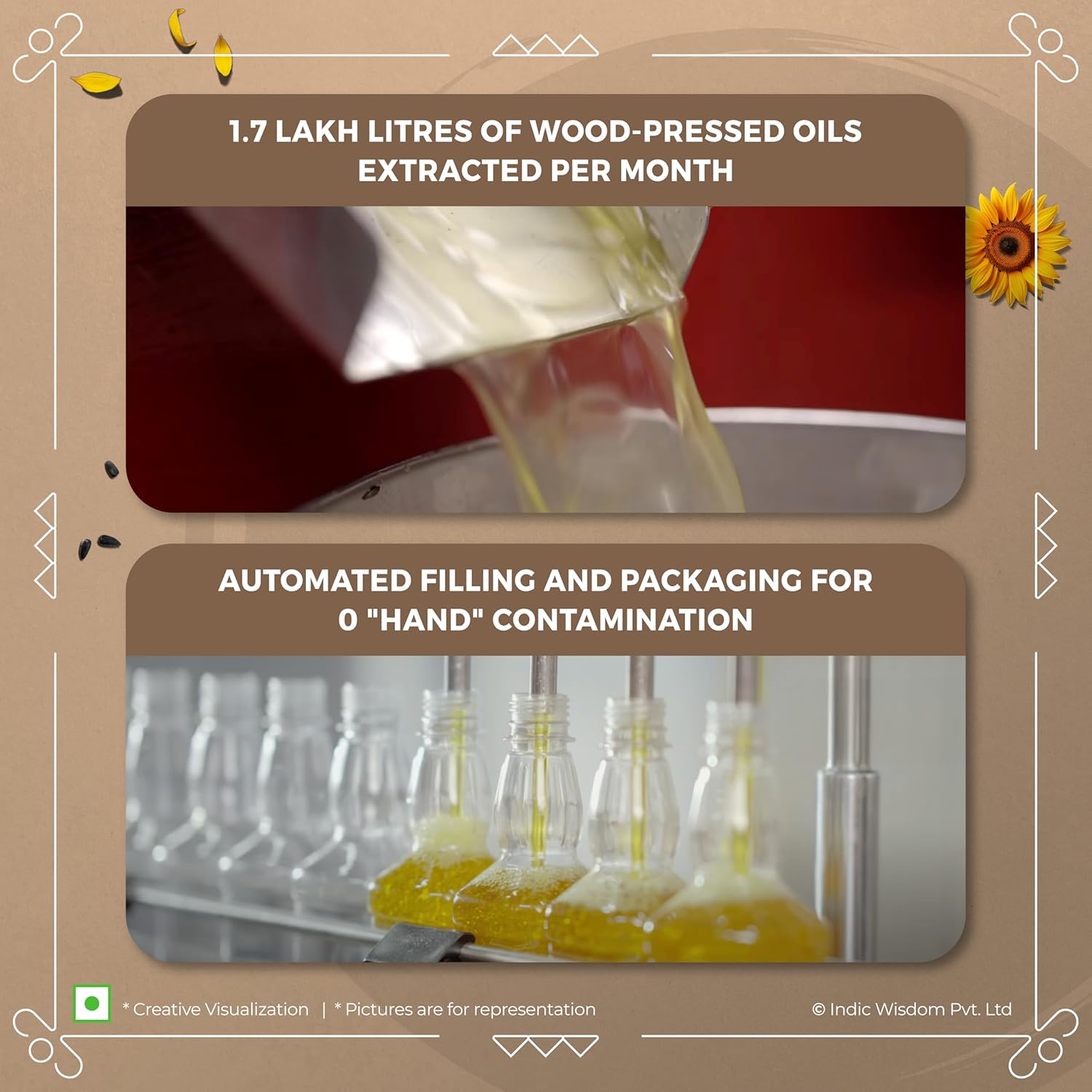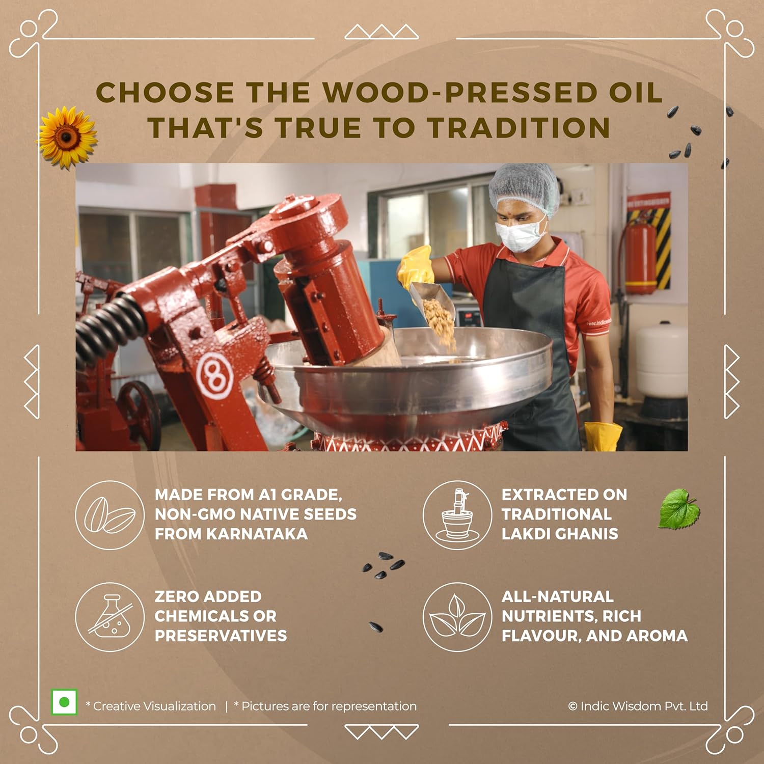 Freshness Retention – The wood churning process requires no heat, ensuring that all the fatty acid chains remain intact. With this, our wood pressed oil provides health benefits you won’t find in regular refined oil sunflower products.