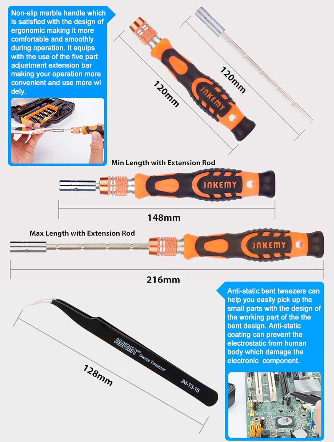 The kit equips with a use of the five part adjustment extension bar, which makes the operation more conveninent and can be used more widely. — Anti-Static bent tweezers with the design of working part being bent, can help to easily pick up the small parts.Anti-Static coating can prevent the electrostatic from human body.