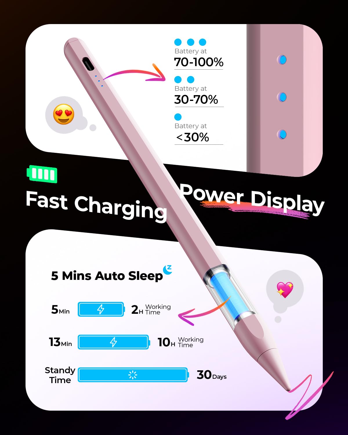 JAMJAKE Stylus for Apple iPad Pencil 5X Faster Charge, Pencil for Apple iPad Compatible with iPad 6-11th Gen, iPad Air 3-5/M2/M3, iPad mini 5/6, iPad Pro 11″/12.9″/M4, Double Tap Turn On/Off – Pink