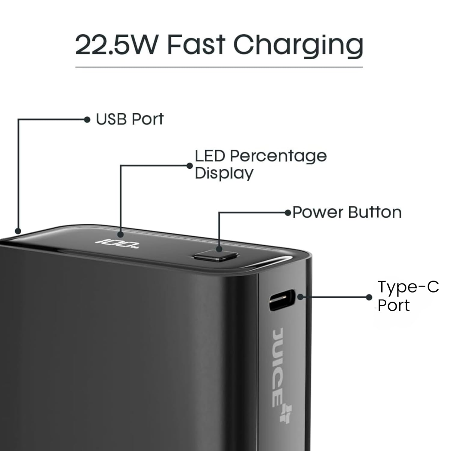 JUICE OJP1004 Compact Power Bank | Slimmest 20000mAh 5V/3A Power Bank | Input Type-C, USB Output High-Speed Charging Wireless Power Bank | External Phone Power Bank Compatible with Mobile (Black)