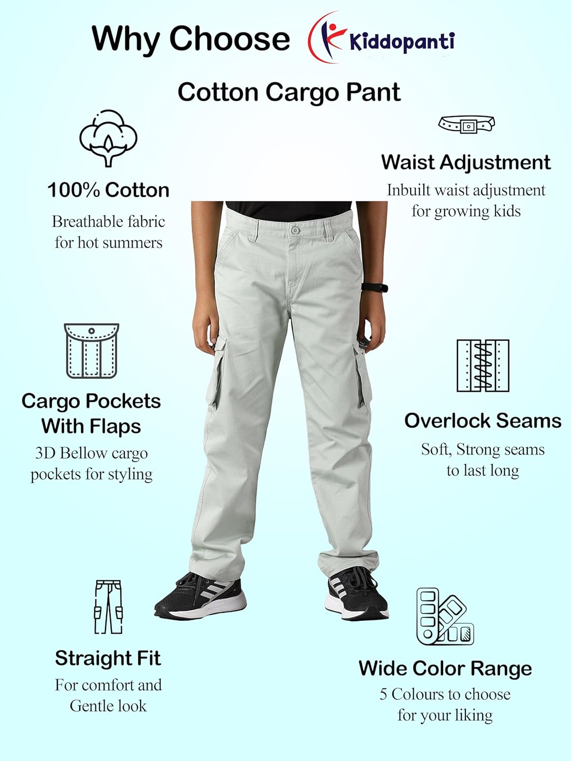 KiddoPanti Boys Cargo Pants | 100% Cotton Twill | Comfortable Regular Fit | Elastic Waistband & Zip Fly | 6 Pocket Lower for Kids | Full-Length Casual Wear