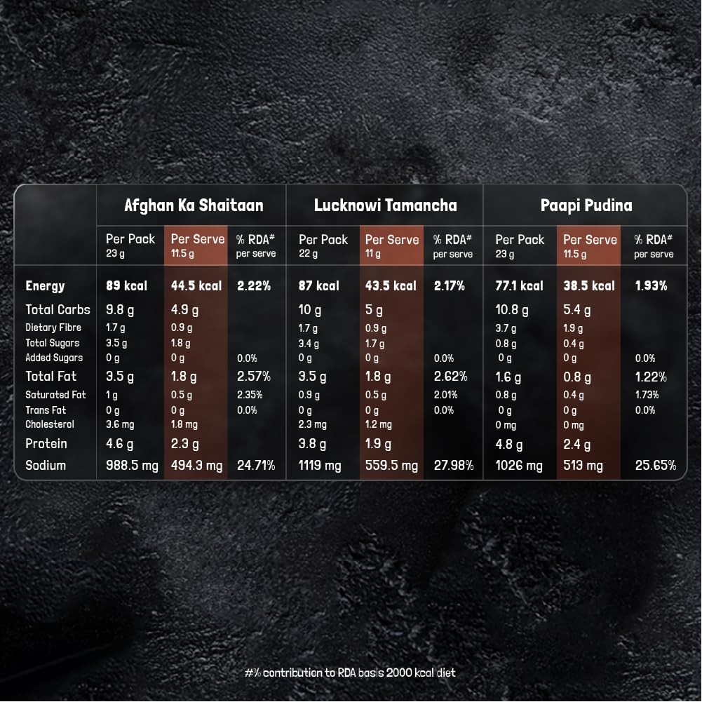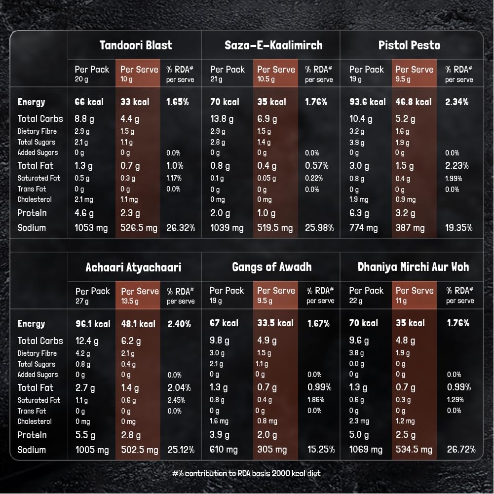 EACH PACK CONTAINS 2x Tandoori Blast, 1x Saza-E-KaaliMirch, 1x Pistol Pesto, 1x Achaari Atyachaari, 1x Gangs of Awadh, 1x Dhaniya Mirchi Aur Woh, 1x Afghan-Ka-Shaitaan, 1x Lucknowi Tamancha, 1x Paapi Pudina. Quantity: 220gm