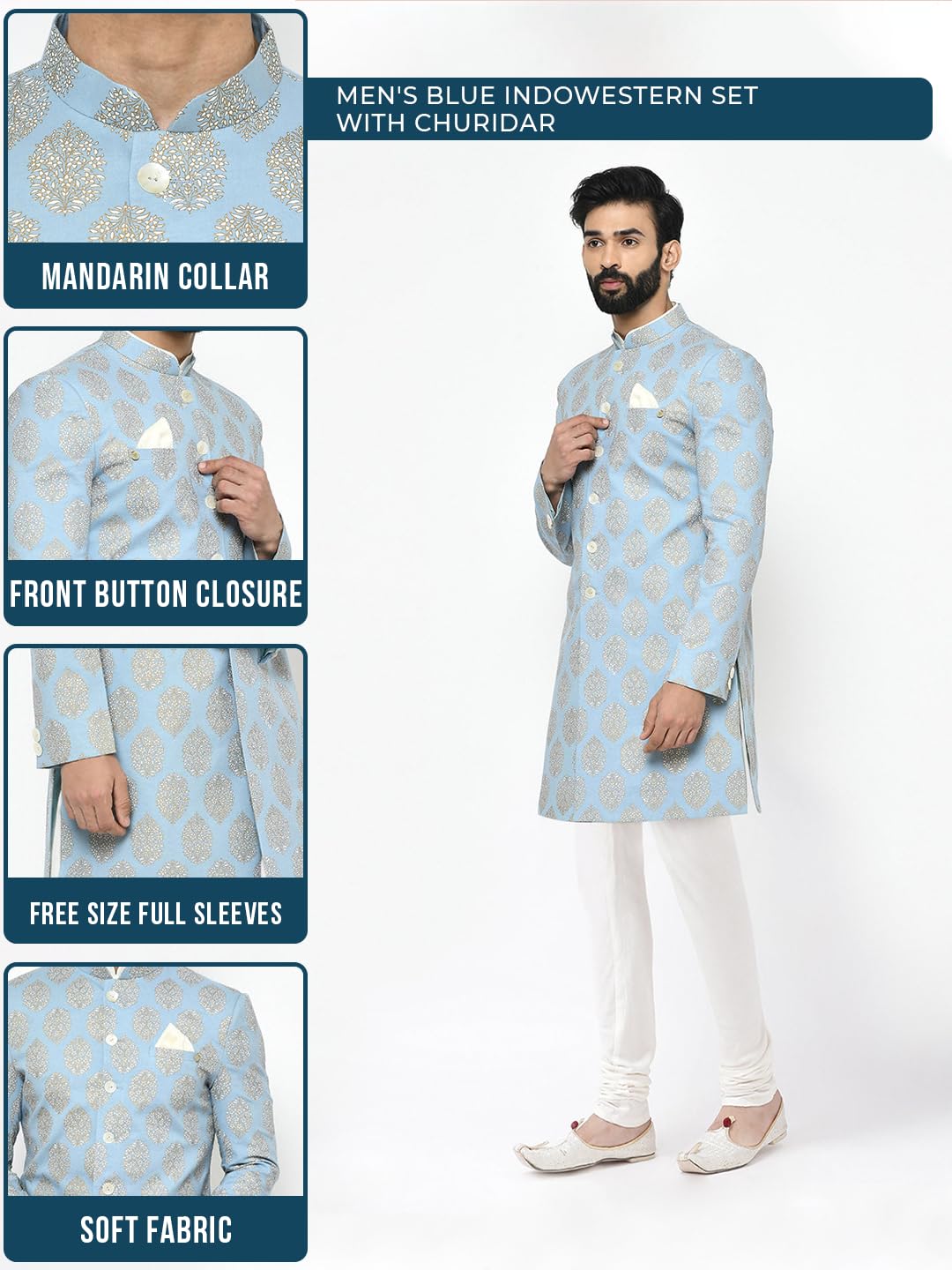KISAH Men Blue Printed Indo-Western Sherwani Set Indo-Western, Full Sleaves, Knee Length, Straight, Regular Fit, Mandarin Collar Ethnic wear