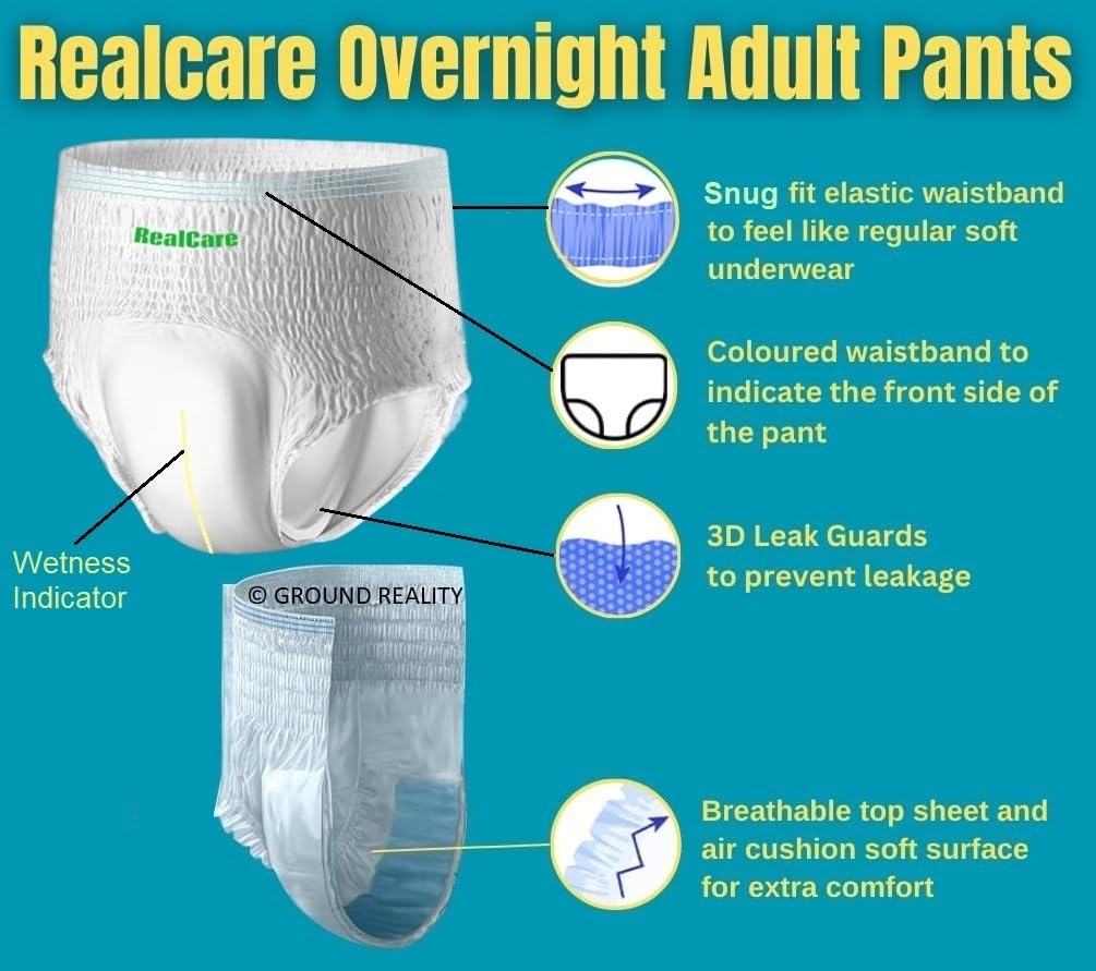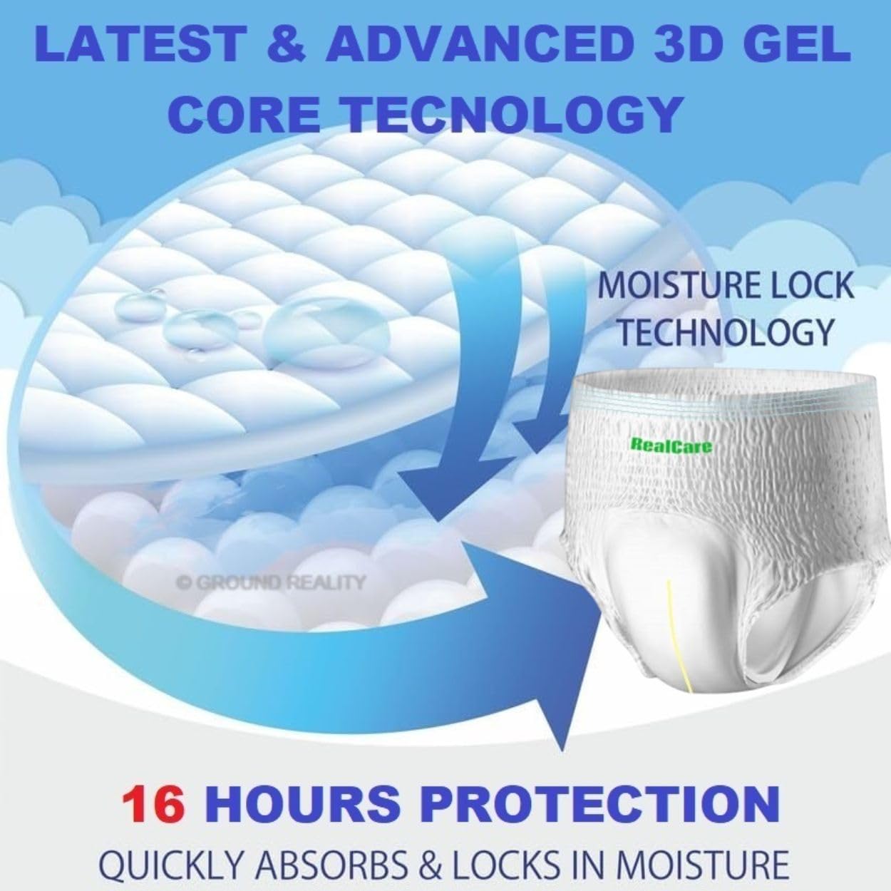 16 hours Protection:- Real care adult pant style pull up diapers are Premium World-Class Hospital Grade (cannot be compared to low cost cheap leaky diapers with only 8 hrs protection). They are equipped with Advanced 3D Gel Core Technology which converts liquid into a gel instantly, long-lasting defense against urine leakage, perfect for overnight or full day use. Made from super soft, breathable material, these diapers allow air to circulate, minimizing the risk of rashes with maximum comfort