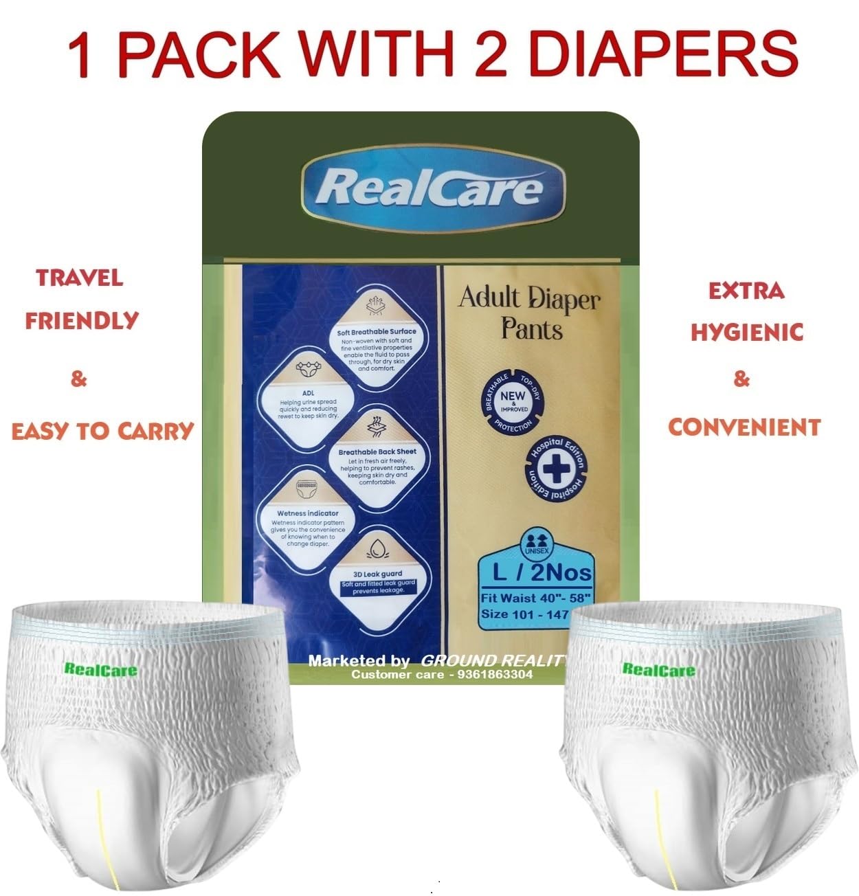 360° Protection & Zero Leakage:- Real Care pant style adult diapers incontinence pads for old age women and men feature double-standing cuffs, experience comprehensive protection with our 360° design, featuring an elastic waistband and snug leg cuffs. This ensures a secure fit that prevents leaks, giving you peace of mind and confidence in your daily activities. It has World-class odour lock technology. Travel friendly pack of 2 diapers. Easy to carry, more convenient and hygienic