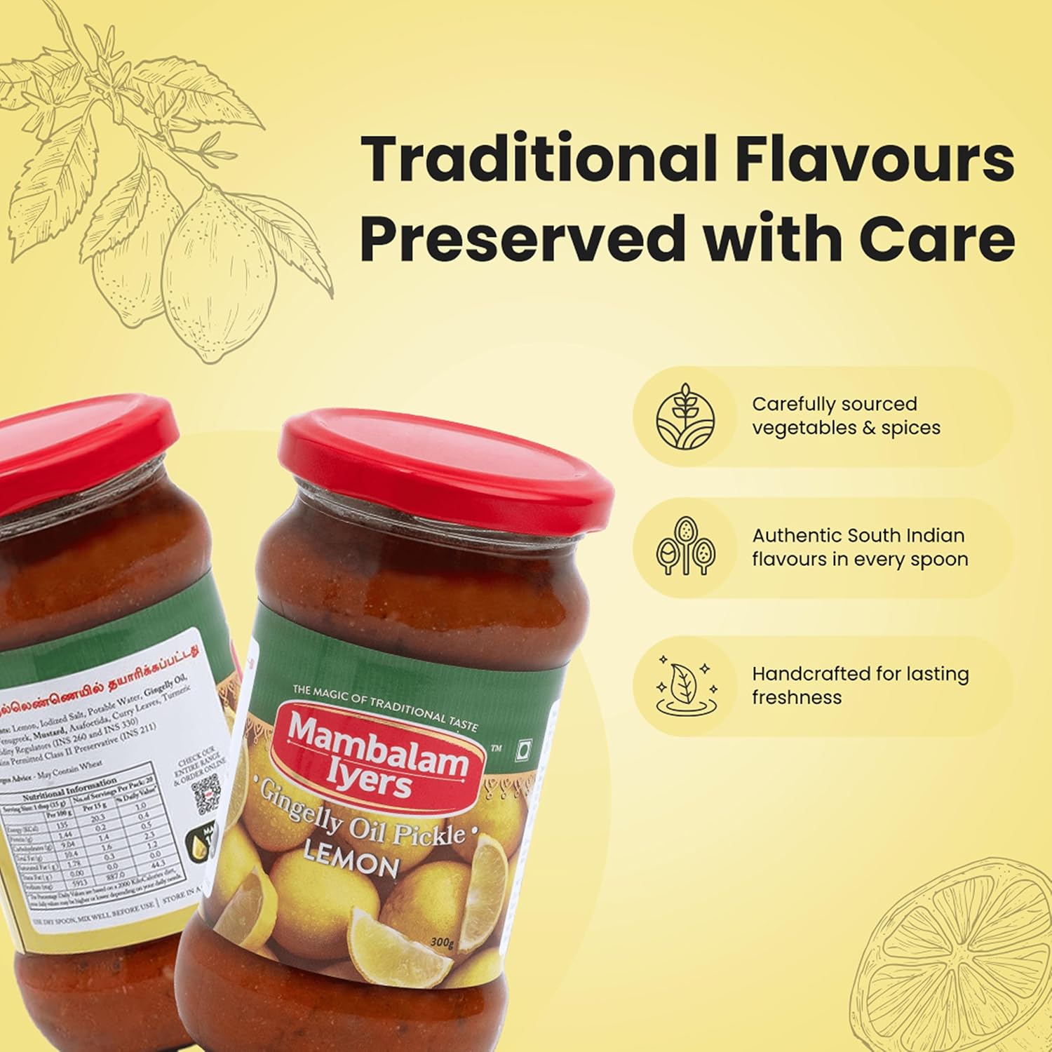 A perfect blend of spicy and sour flavours, a teaspoon of lemon pickle adds a zest to any dish. Made from fresh, carefully sourced and sorted lemons, this traditional pickle is part of every South Indian household.