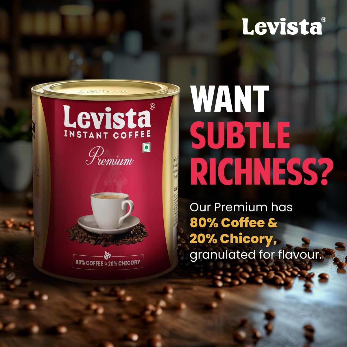 Levista Premium Instant Coffee is blended with high-quality chicory powder and delivers a rich, smooth, and balanced flavour in every cup.