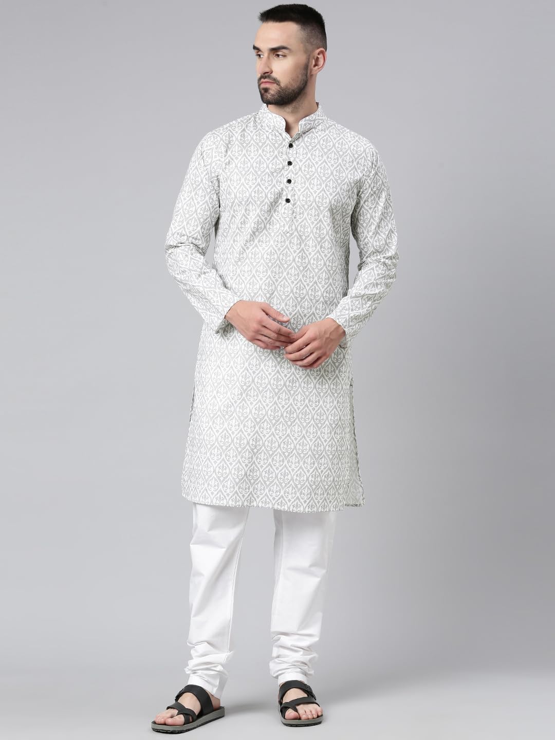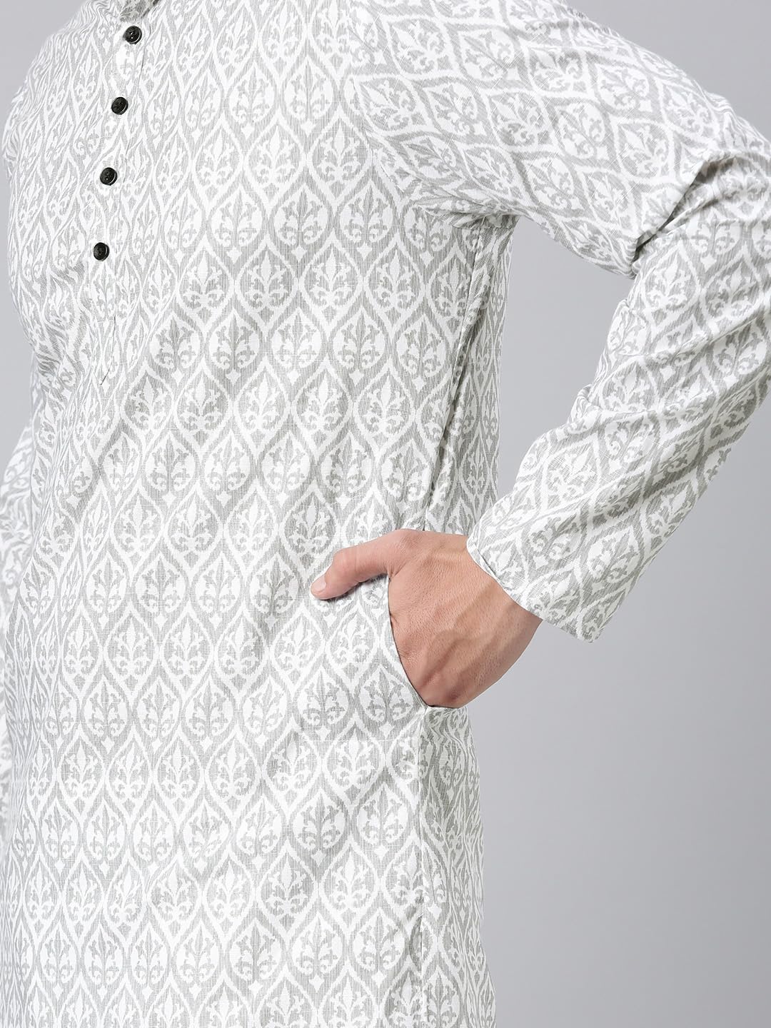 Majestic Man Cotton Mandarin Collar Ethnic Motifs Printed Long Kurta for Men