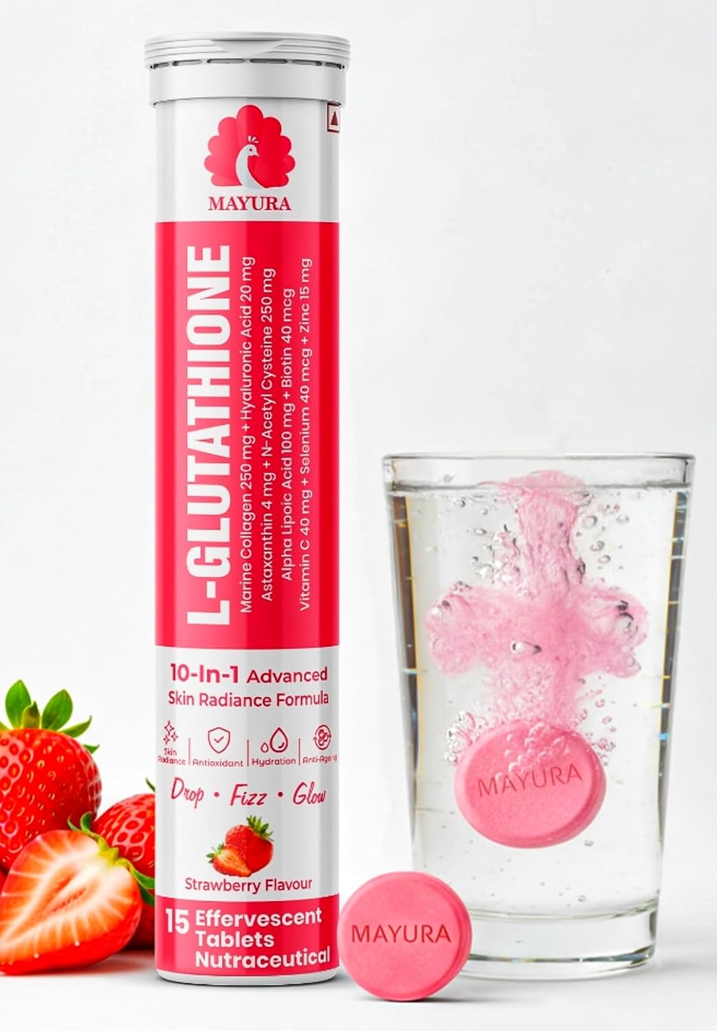 MAYURA’S L-Glutathione Effervescent Tablets is india’s first 10-in-1 Advanced Skin Radiance Formula – Each effervescent tablet delivers a synergistic blend of 10 skin-enhancing ingredients including L-Glutathione, Marine Collagen, NAC, and Vitamin C for a radiant, even-toned complexion.
