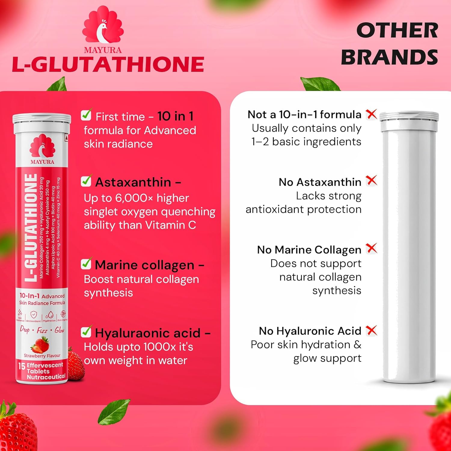 MAYURA’S L-Glutathione 500mg Effervescent Tablets | 10-in-1 Advanced Skin Radiance Formula with Marine Collagen, Hyaluronic Acid, Astaxanthin, Vitamin C, NAC, ALA, Biotin, Selenium & Zinc | Skin Glow, Brightening, Hydration, Detox Support ,Antioxidant & Anti Ageing Supplement | Strawberry Flavour | 15 Tablets