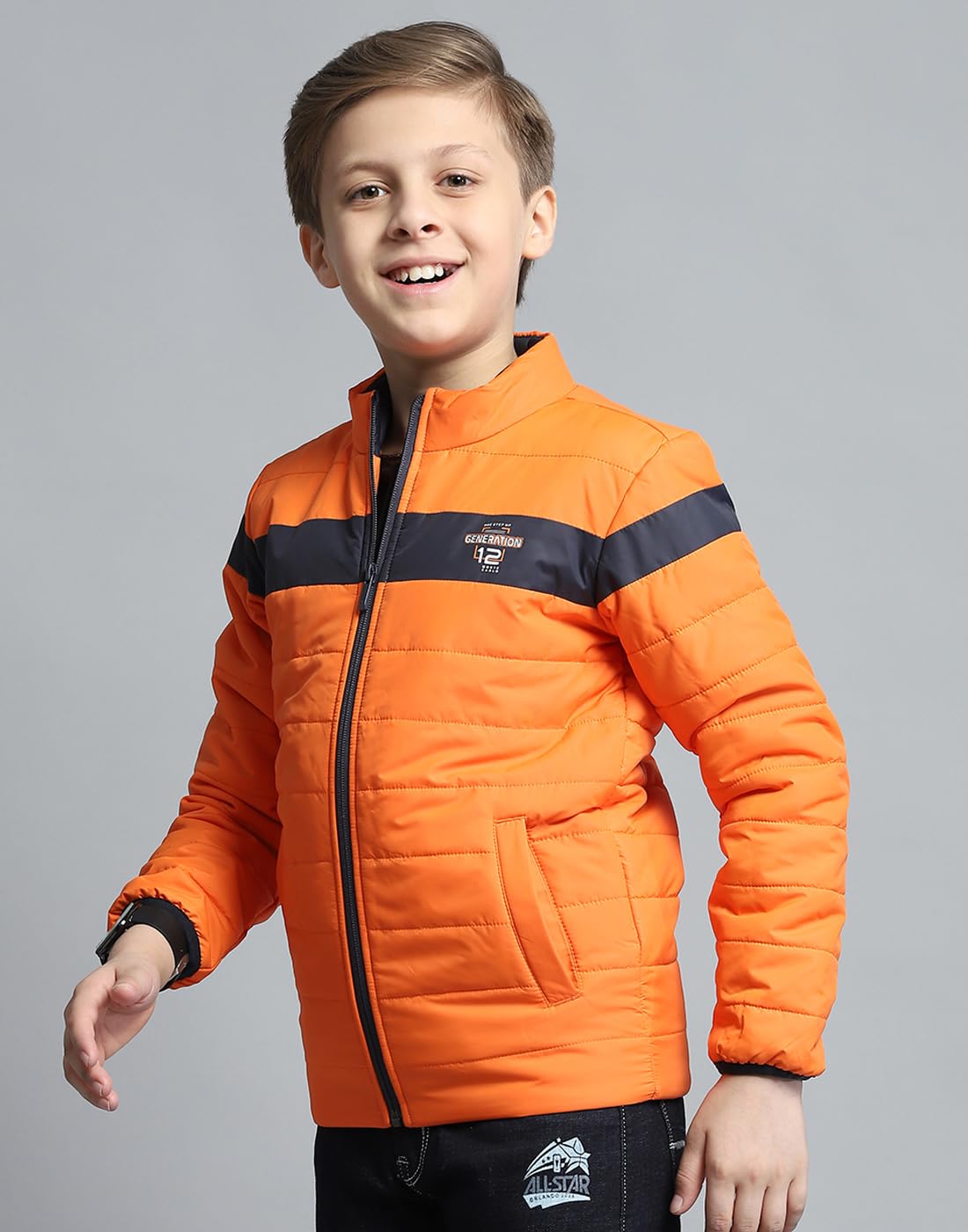 Monte Carlo Boys Printed Orange Mock Neck Full Sleeve Jacket