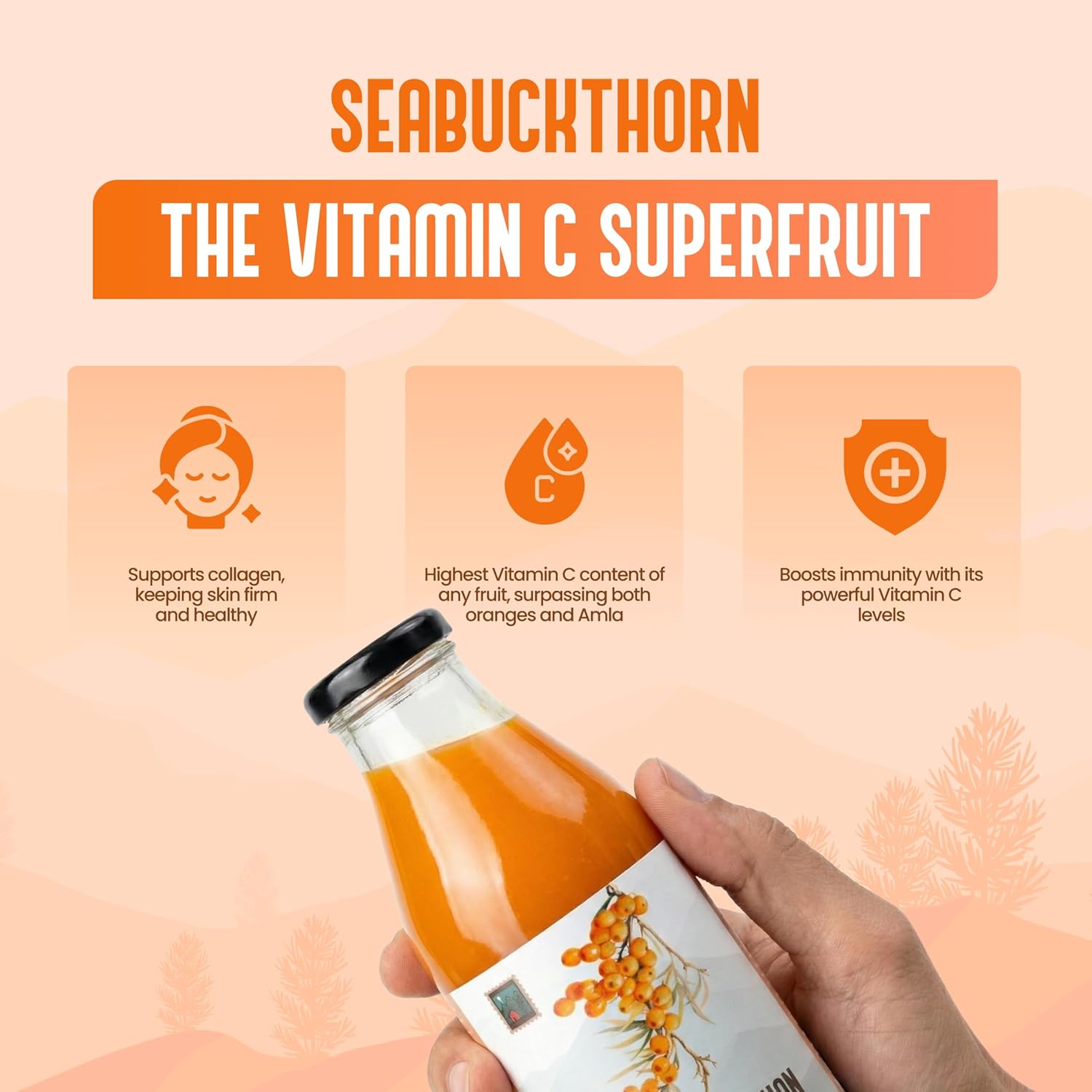 Highest Vitamin C for collagen boosting – Packed with more Vitamin C than oranges and amla, this juice helps boost collagen, improving skin elasticity, and keeping your skin firm, glowing, and youthful.