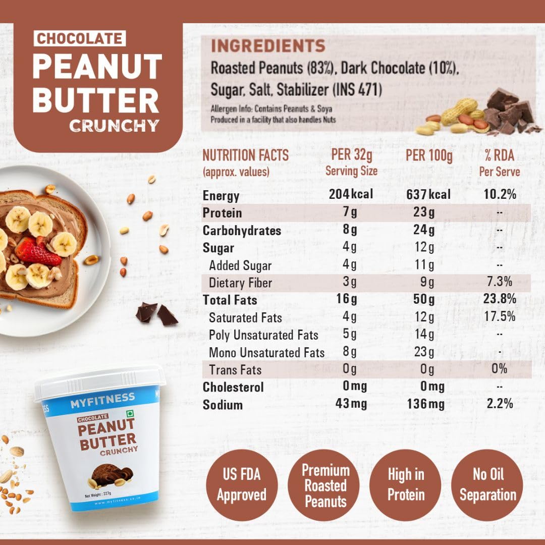 MyFitness is India’s first nut butter brand registered with the U.S. FDA. Crafted from 100% roasted peanuts, it delivers a delectable taste and optimal nutrition. It is an excellent source of protein, healthy fats, and dietary fiber, making it a perfect addition to any wellness regimen.