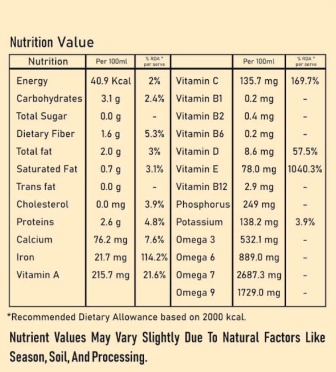 ✅ Cold-Pressed to Retain 190+ Nutrients Carefully cold-pressed to preserve bioactive vitamins, flavonoids, and Omega 3, 6, 7 & 9, ensuring every dose is loaded with natural power.