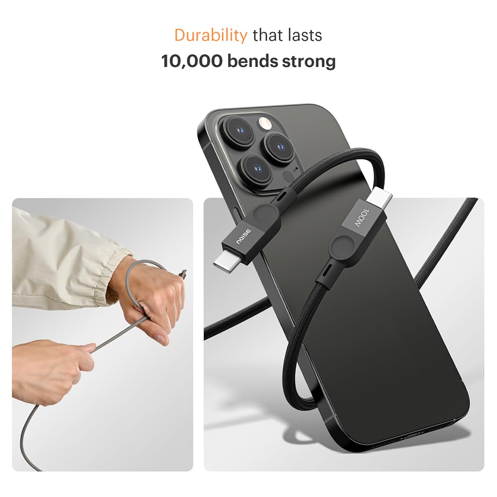 Noise Power Series 100W USB C to USB C Cable | 5A PD Fast Charging | Self-Winding | 1M Braided | 50x Durable | 480Mbps Speed | Cable for iPhone, Android, MacBook & Tablets (Grey)